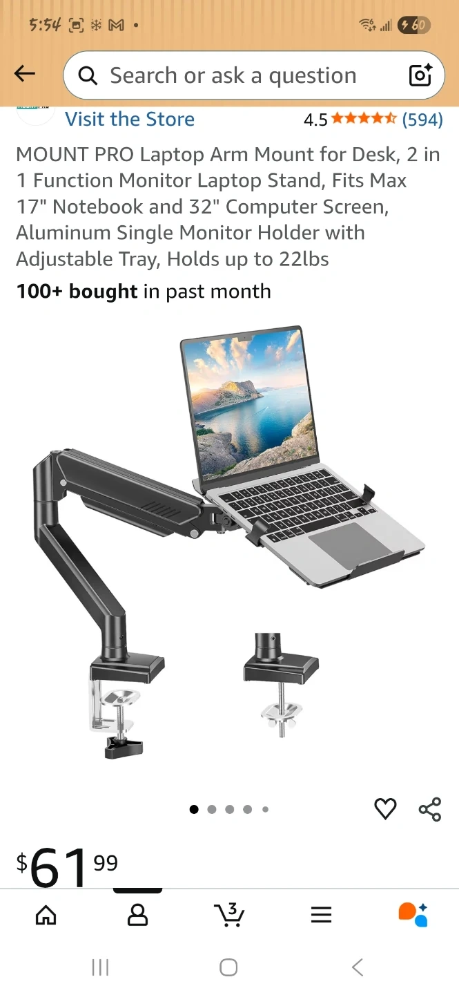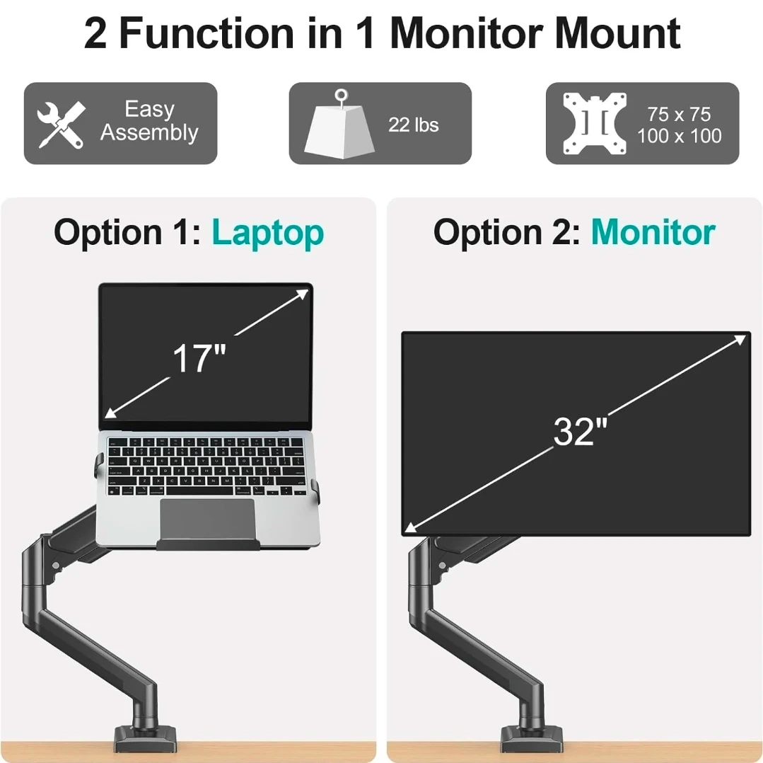 This MOUNT PRO dual-function arm mount holds either a laptop or a monitor. It offers full motion adjustment for swivel, tilt, and rotation. The mount supports a maximum weight of 22 lbs and extends up to 19.9 inches.