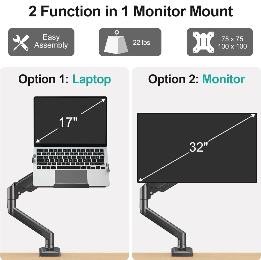This MOUNT PRO dual-function arm mount holds either a laptop or a monitor. It offers full motion adjustment for swivel, tilt, and rotation. The mount supports a maximum weight of 22 lbs and extends up to 19.9 inches.