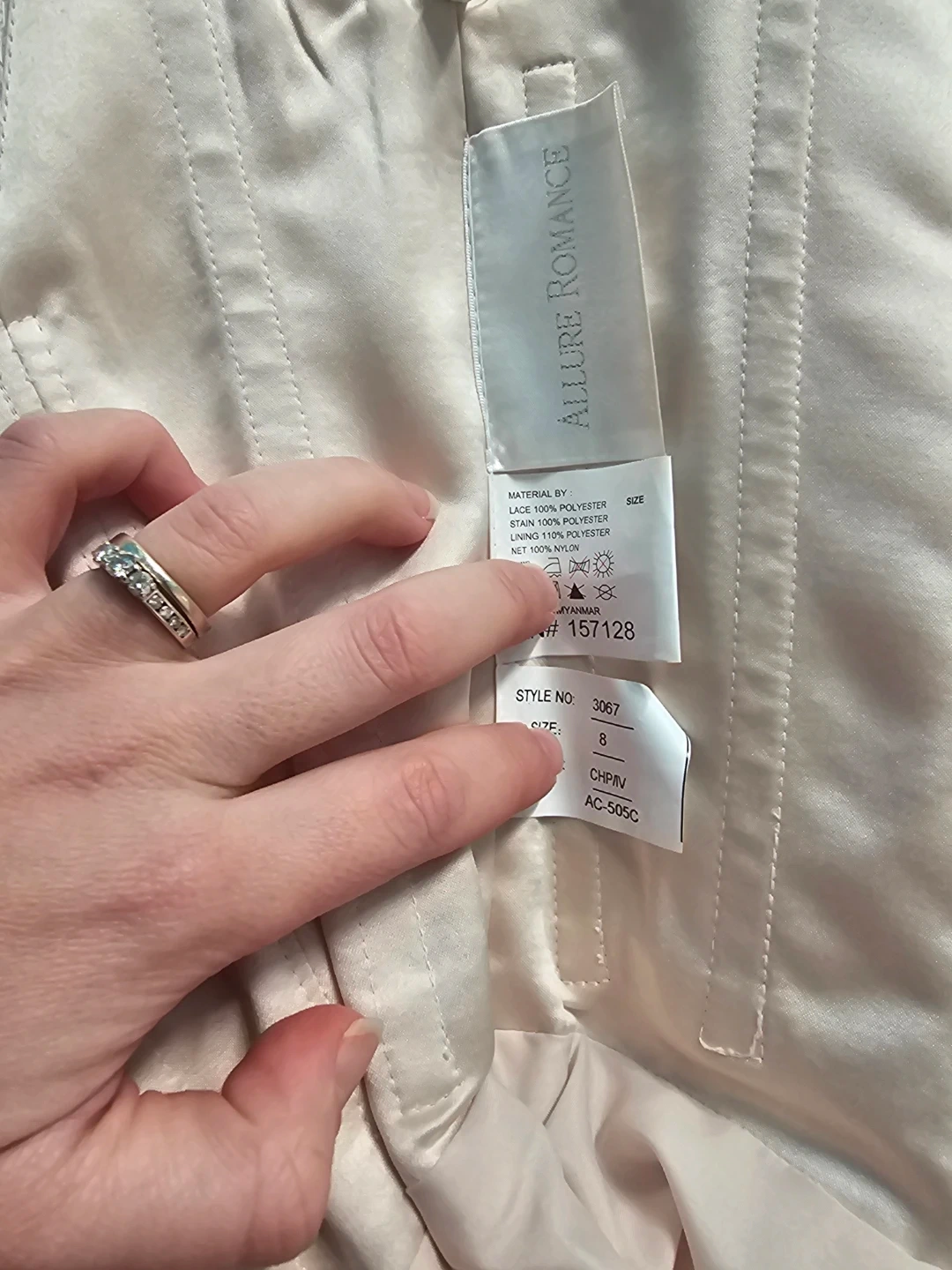Selling an Allure Romance wedding dress in size 8. It's made with lace and polyester for a beautiful look. The style number is 3067. It's in great condition and ready for your special day!