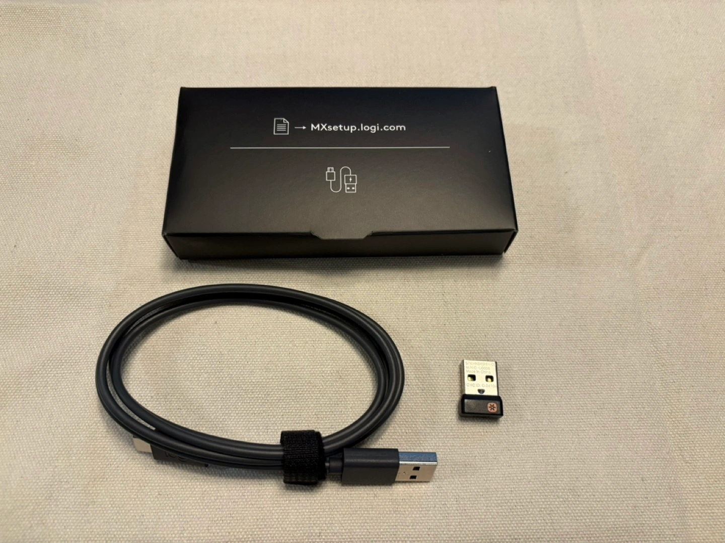 Logitech MX Keys with the charging cable and usb receiver.