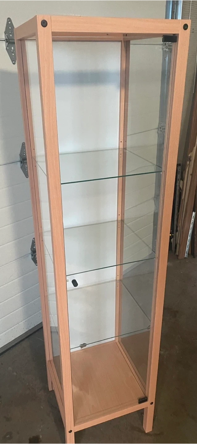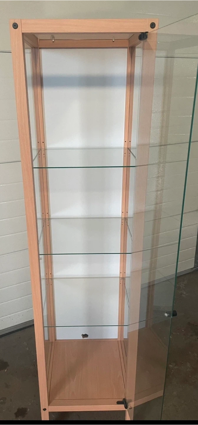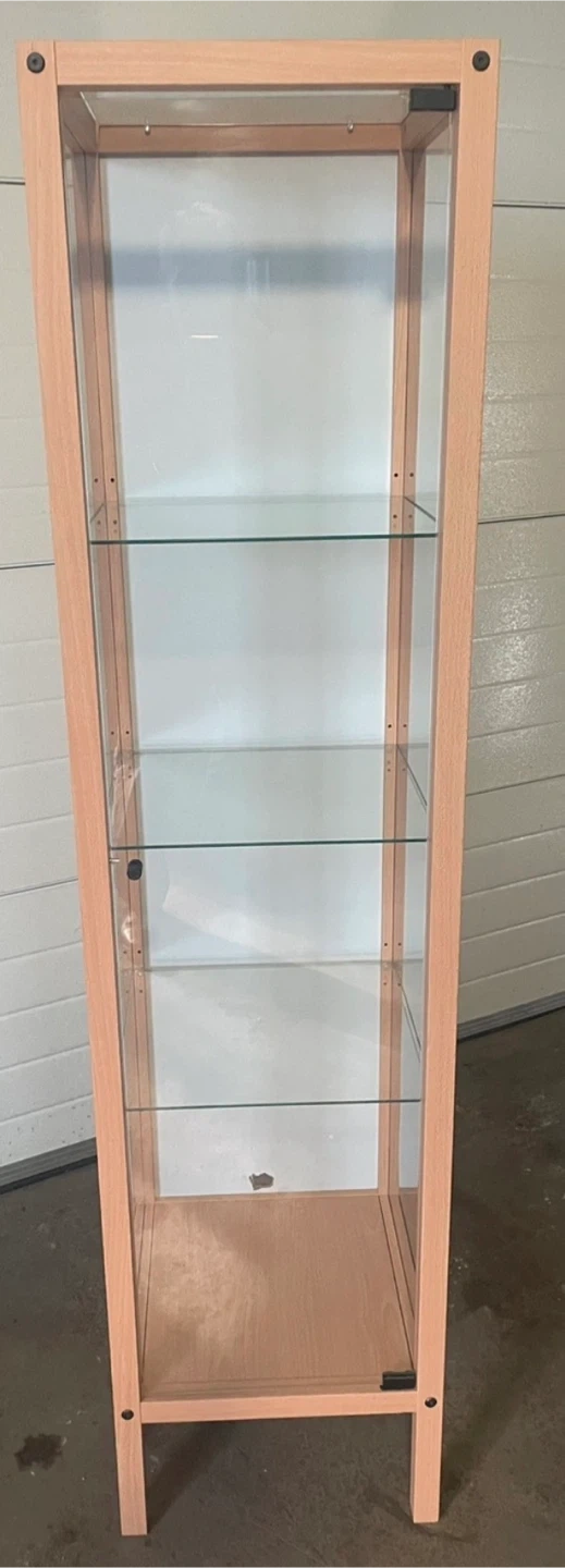 This tall display cabinet has a light wood frame and clear glass panels. It comes with four adjustable glass shelves. It's perfect for showcasing collectibles or decorative items!