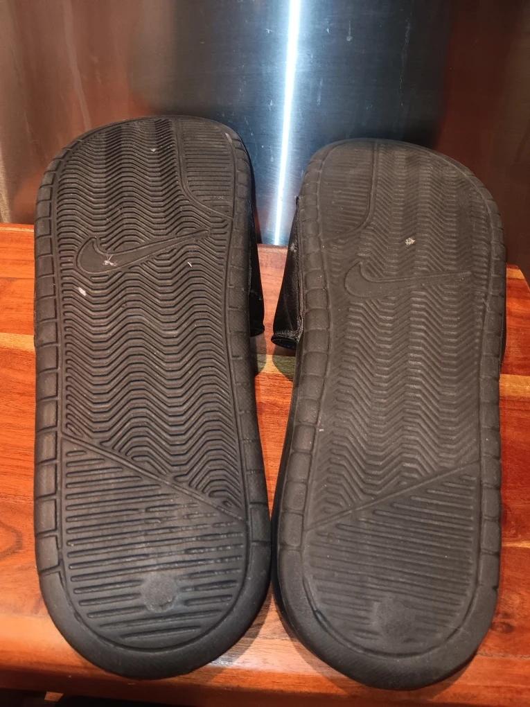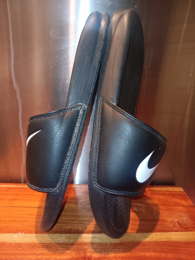 These are black Nike slide sandals. They feature the iconic Nike swoosh logo on the strap. The soles have a textured grip pattern. Perfect for casual wear or after sports!