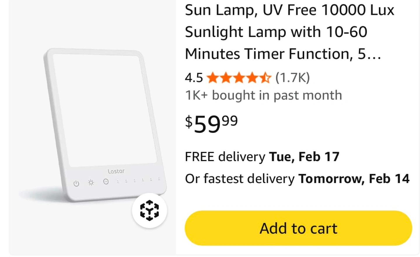 This is a Lastar Light Therapy Lamp. It has a timer function with settings for 10, 20, 30, 40, 50, or 60 minutes. The lamp is UV-free and provides 10000 lux brightness. It's white and includes the original box and power adapter.