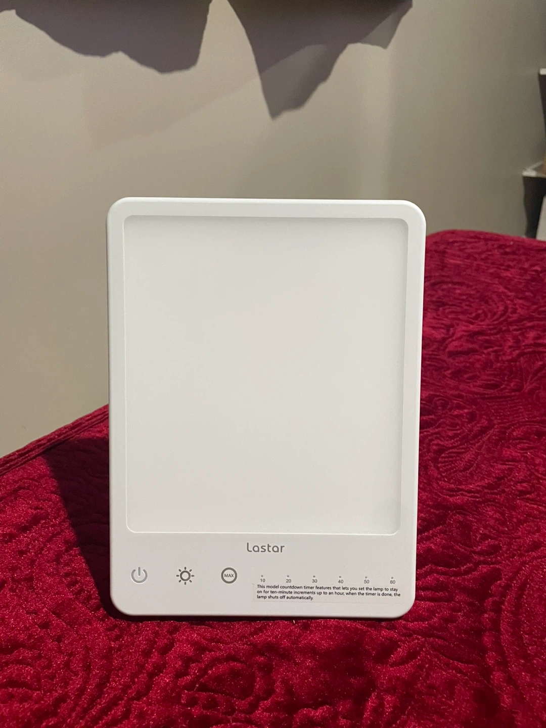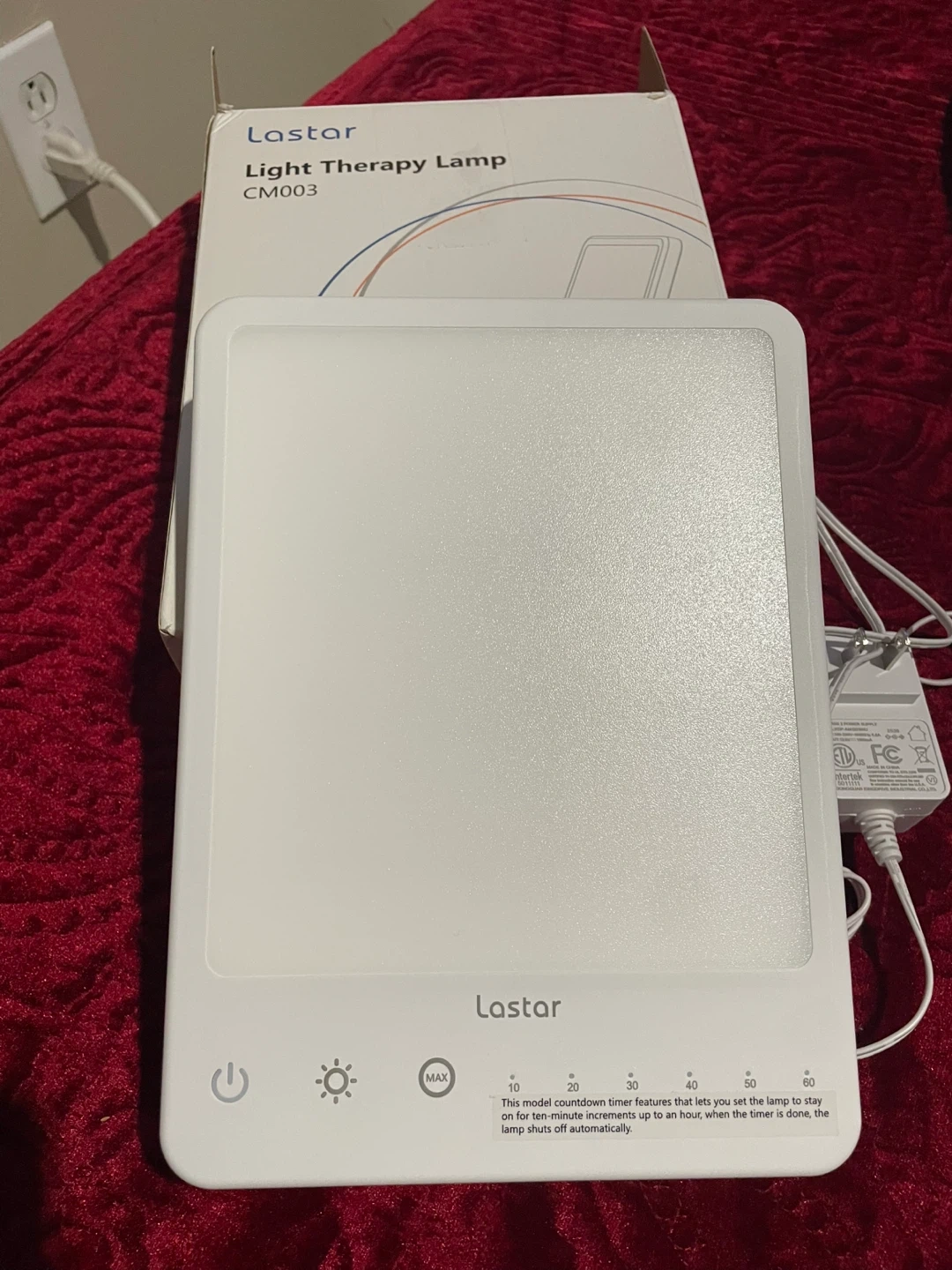 This is a Lastar Light Therapy Lamp. It has a timer function with settings for 10, 20, 30, 40, 50, or 60 minutes. The lamp is UV-free and provides 10000 lux brightness. It's white and includes the original box and power adapter.