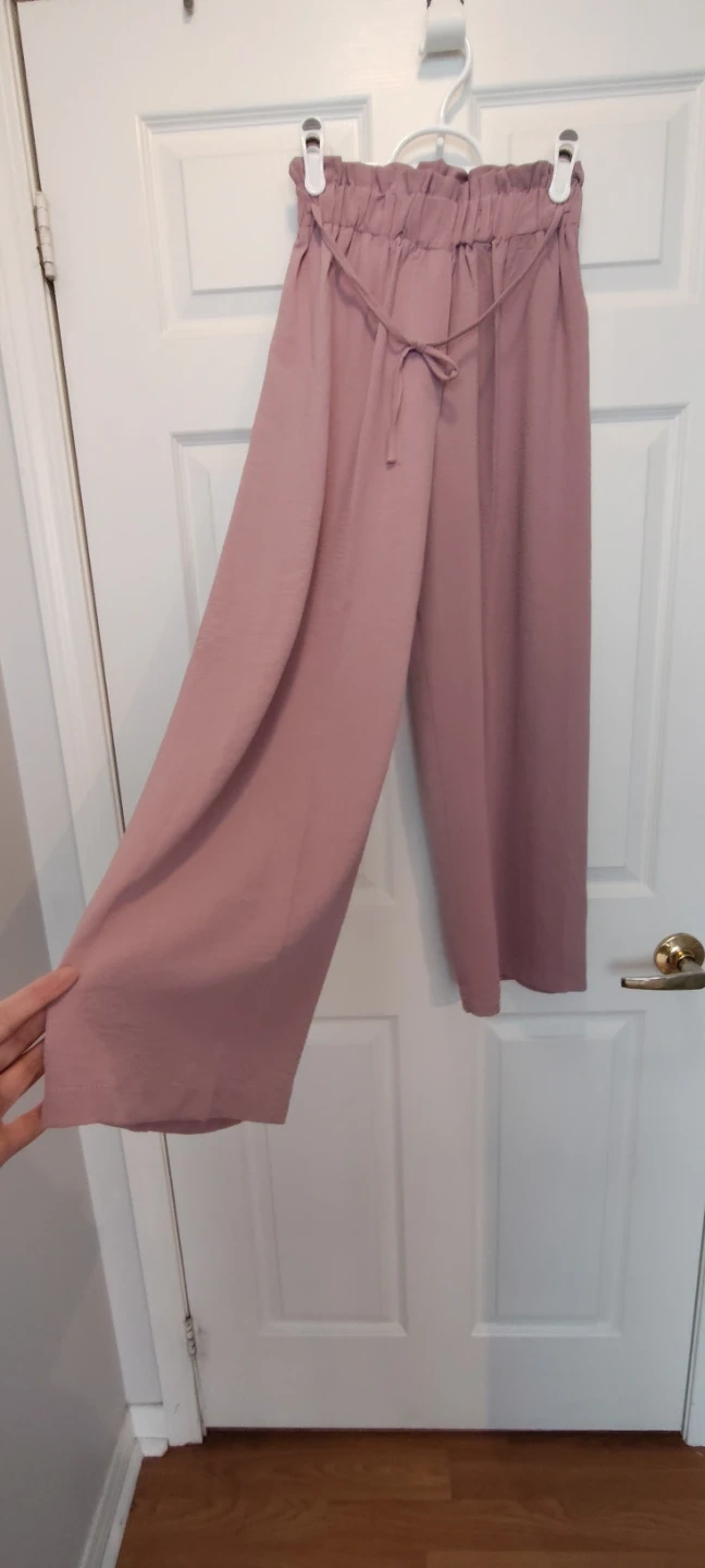 These VAIA pants feature a comfortable paperbag waist with a waist string for flexible adjustment. They're a lovely muted rose colour and have a crinkled texture. Wide leg silhouette.