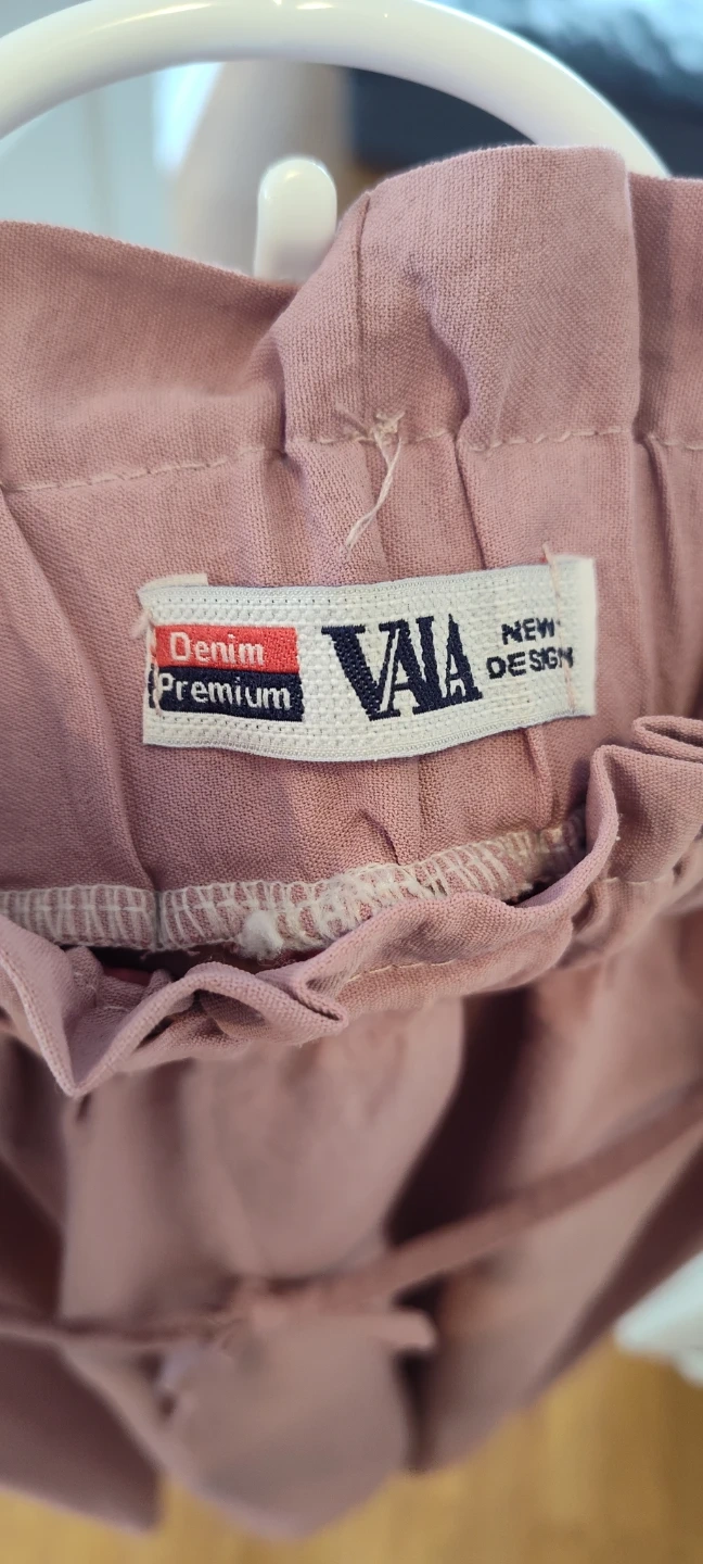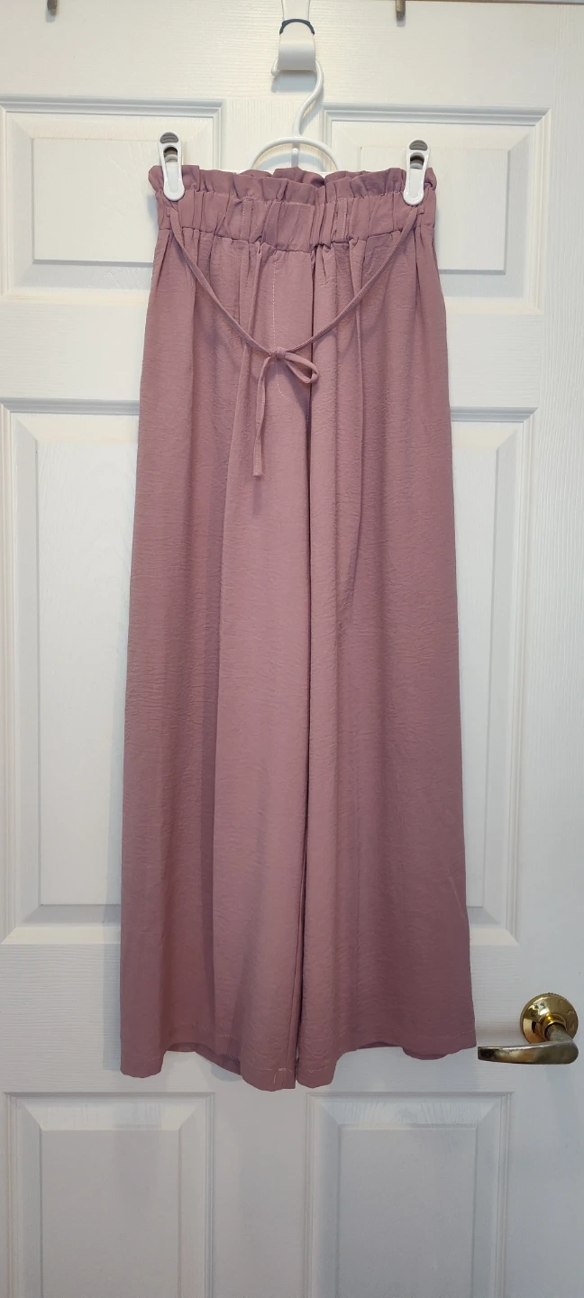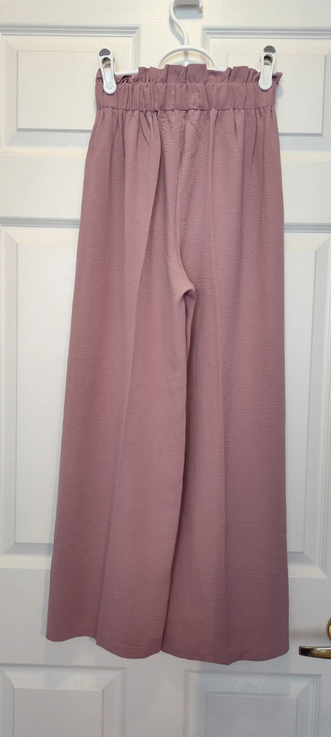 These VAIA pants feature a comfortable paperbag waist with a waist string for flexible adjustment. They're a lovely muted rose colour and have a crinkled texture. Wide leg silhouette.