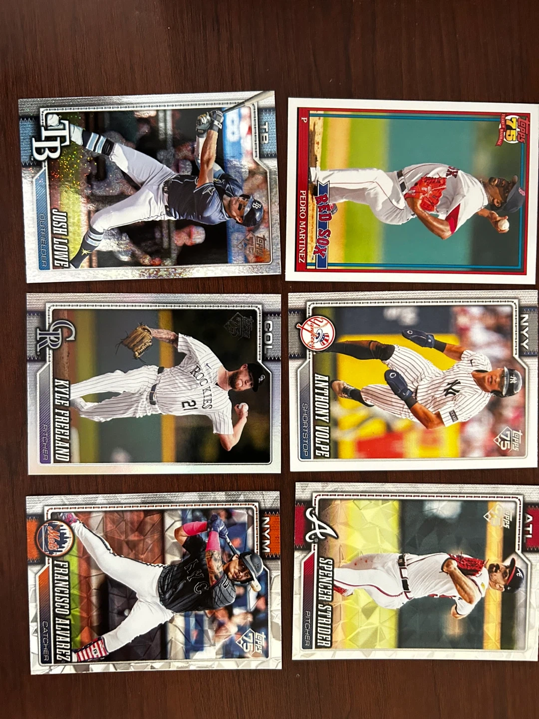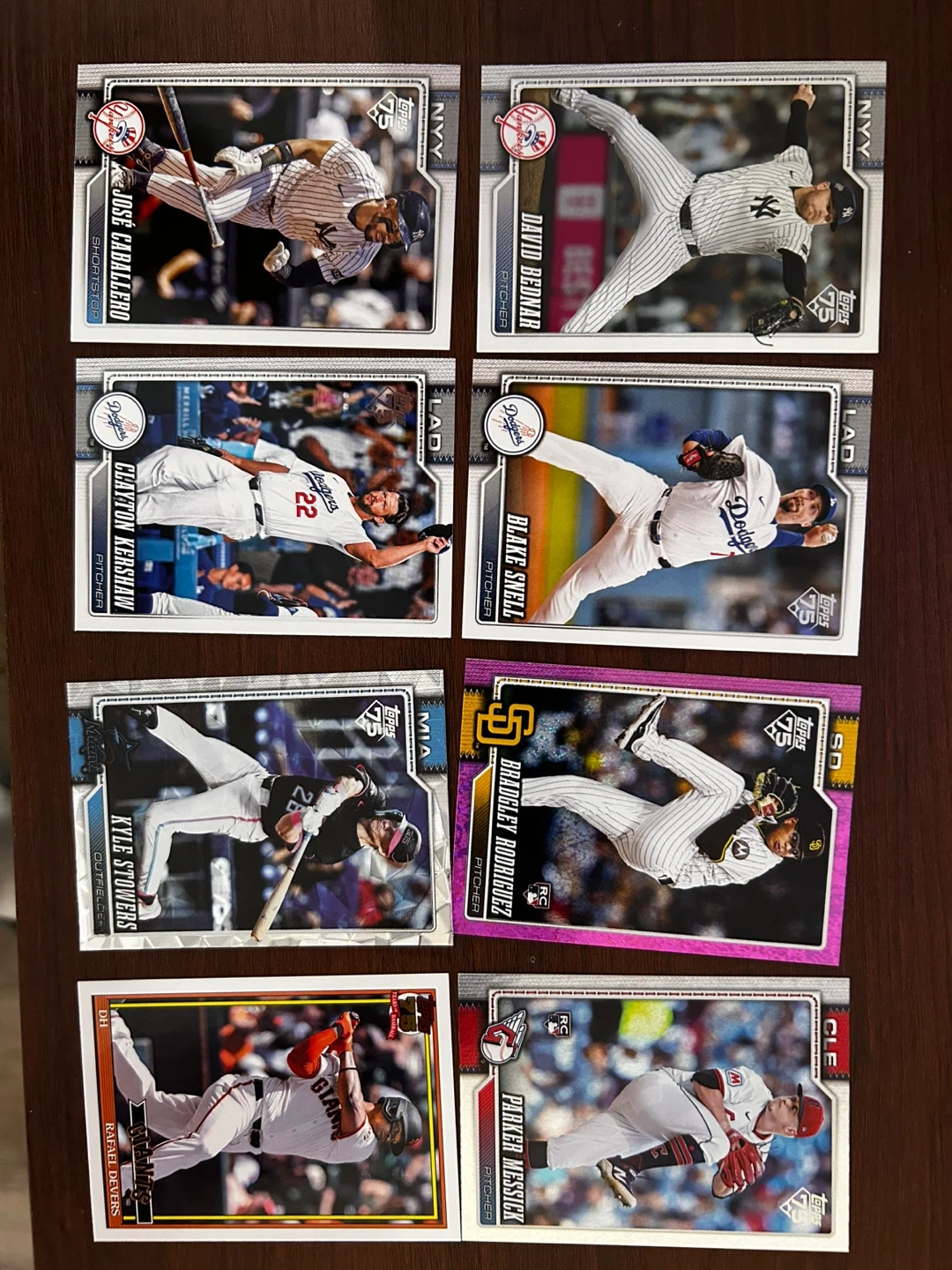 Collection of Topps baseball trading cards featuring various players. Each card showcases a different athlete in action. These cards are perfect for any baseball card collector!