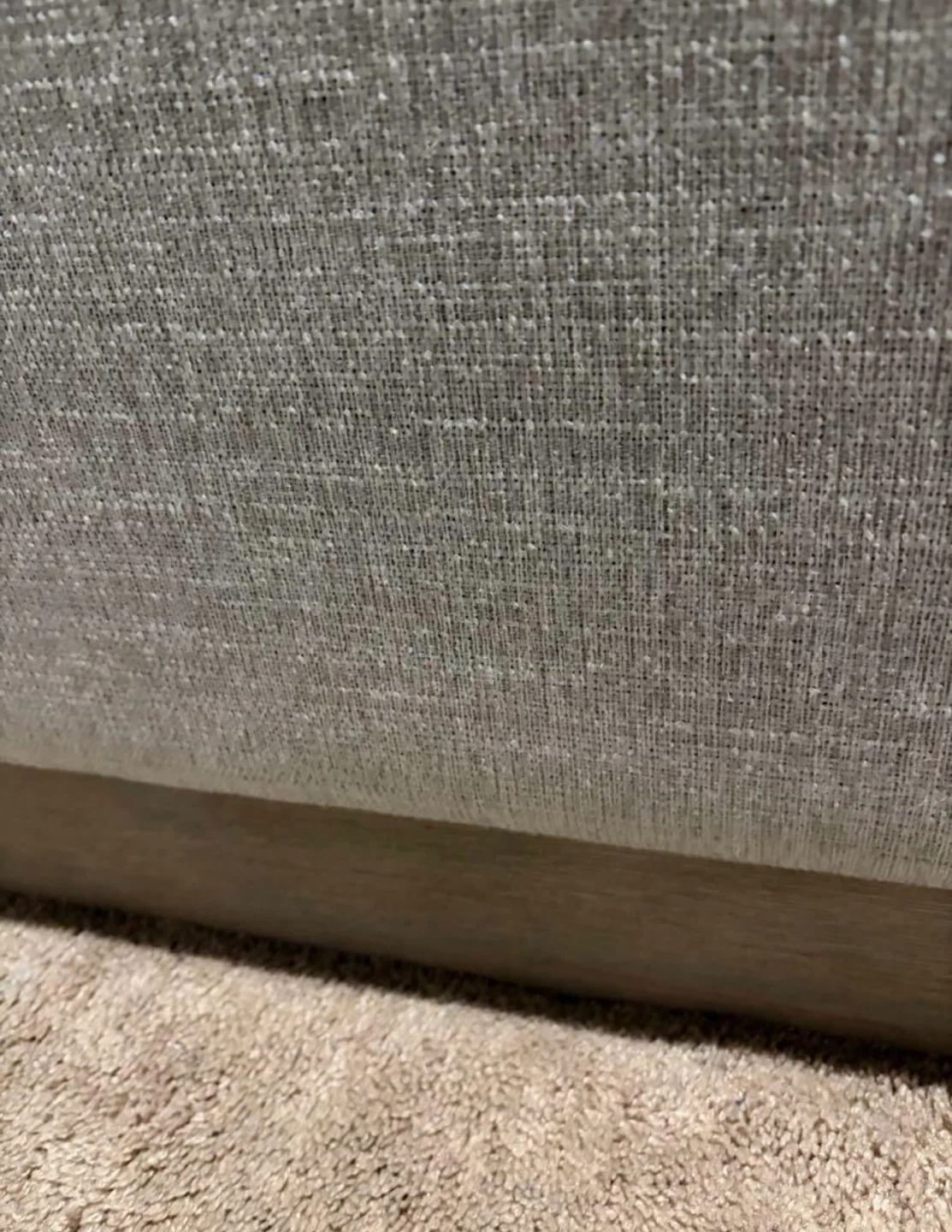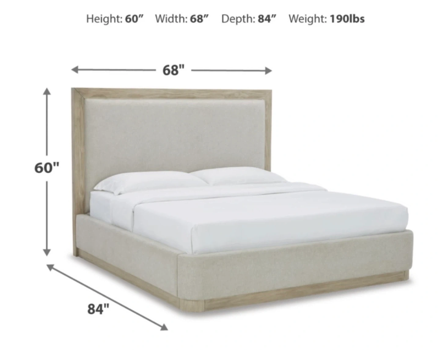 This bed frame has a neutral upholstered headboard and base with a light wood trim. Its dimensions are 60" H x 68" W x 84" D. It's a sturdy and stylish addition to any bedroom!