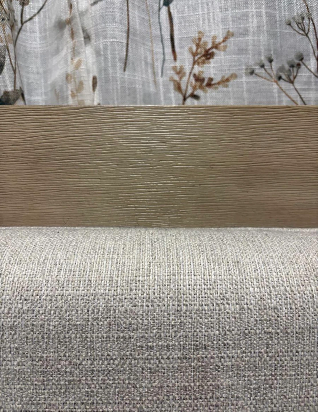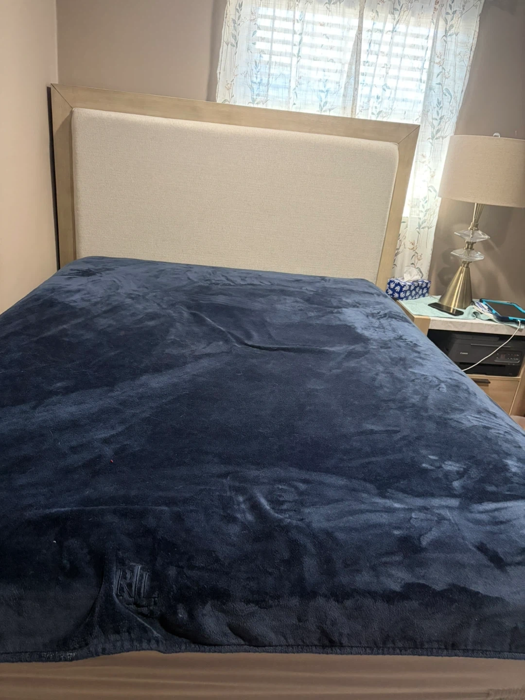 This bed frame has a neutral upholstered headboard and base with a light wood trim. Its dimensions are 60" H x 68" W x 84" D. It's a sturdy and stylish addition to any bedroom!