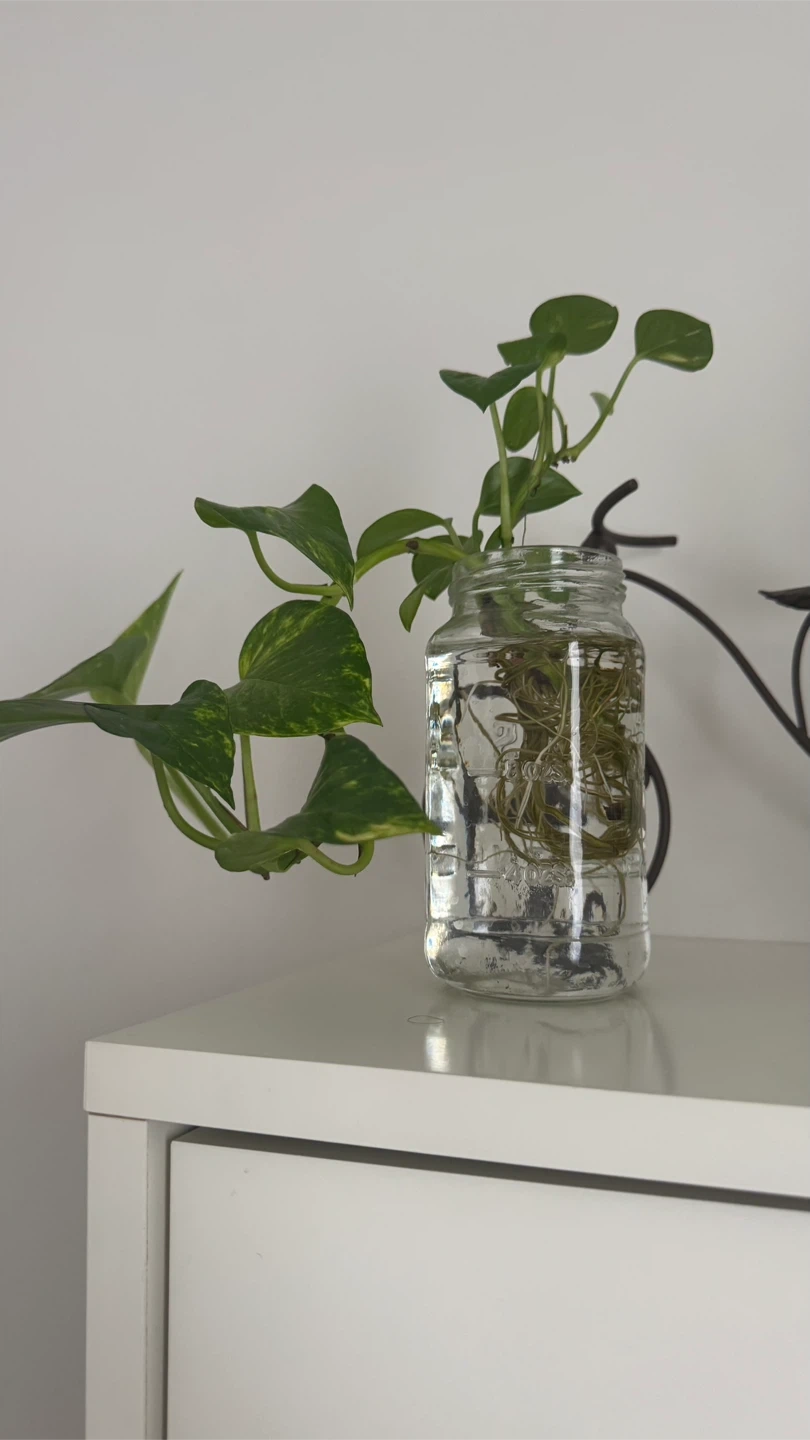 A healthy Pothos plant cutting rooted in water. It's in a clear glass jar with visible roots. This plant is great for adding some greenery to your space!