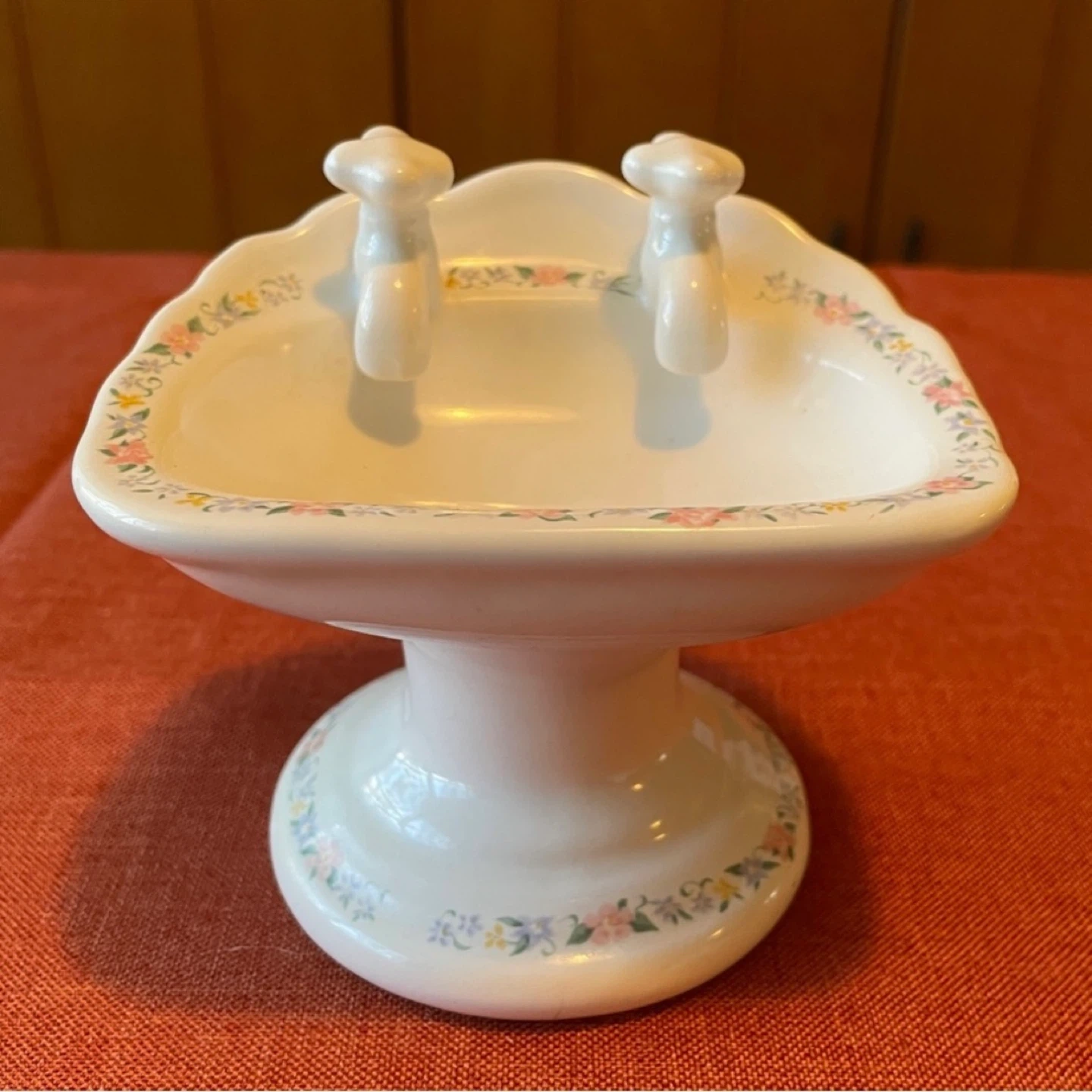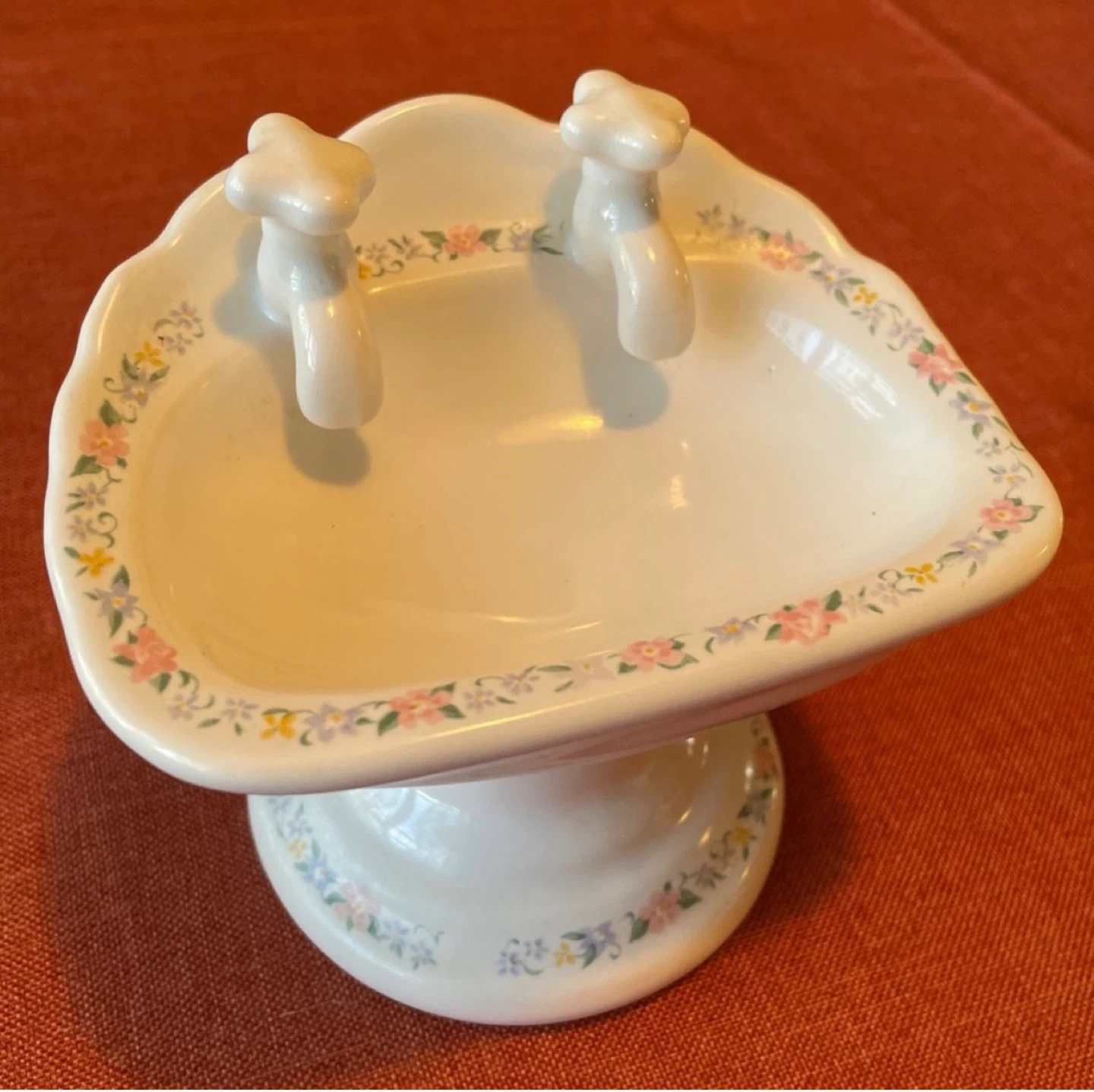 A delightful figural soap dish designed to resemble a classic pedestal bathroom sink with white porcelain, colorful floral border, and two decorative faux faucets.