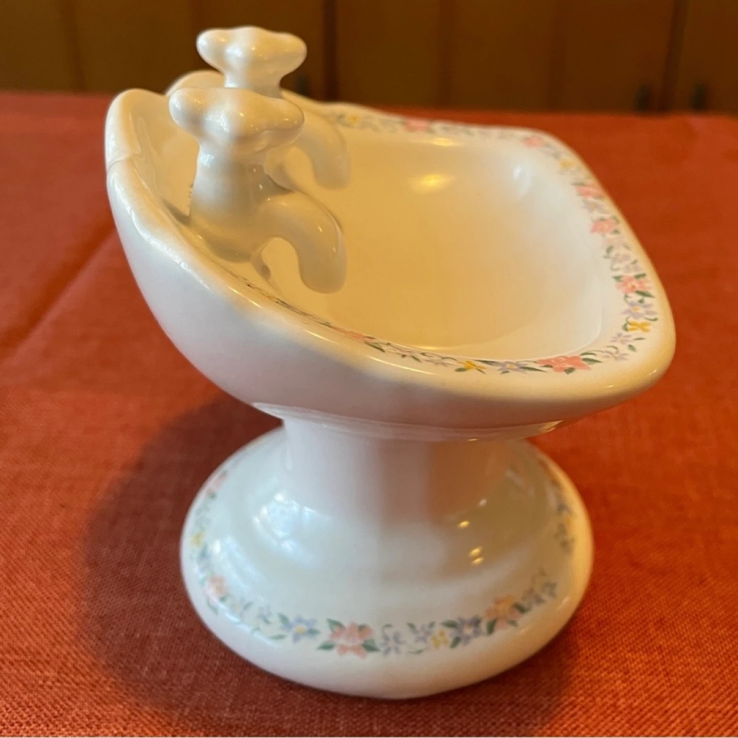 A delightful figural soap dish designed to resemble a classic pedestal bathroom sink with white porcelain, colorful floral border, and two decorative faux faucets.