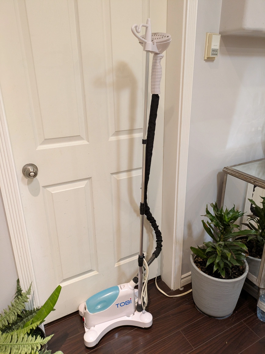 The Tobi steamer (often referred to as Tobi Travel Steamer or Tobi Platinum) is a compact, handheld, or portable upright garment cleaner designed to remove wrinkles, odors, and sanitize clothing. It is marketed as a faster alternative to traditional ironing, utilizing steam to relax fabric fibers. It is commonly used for clothes on hangers and for travel.