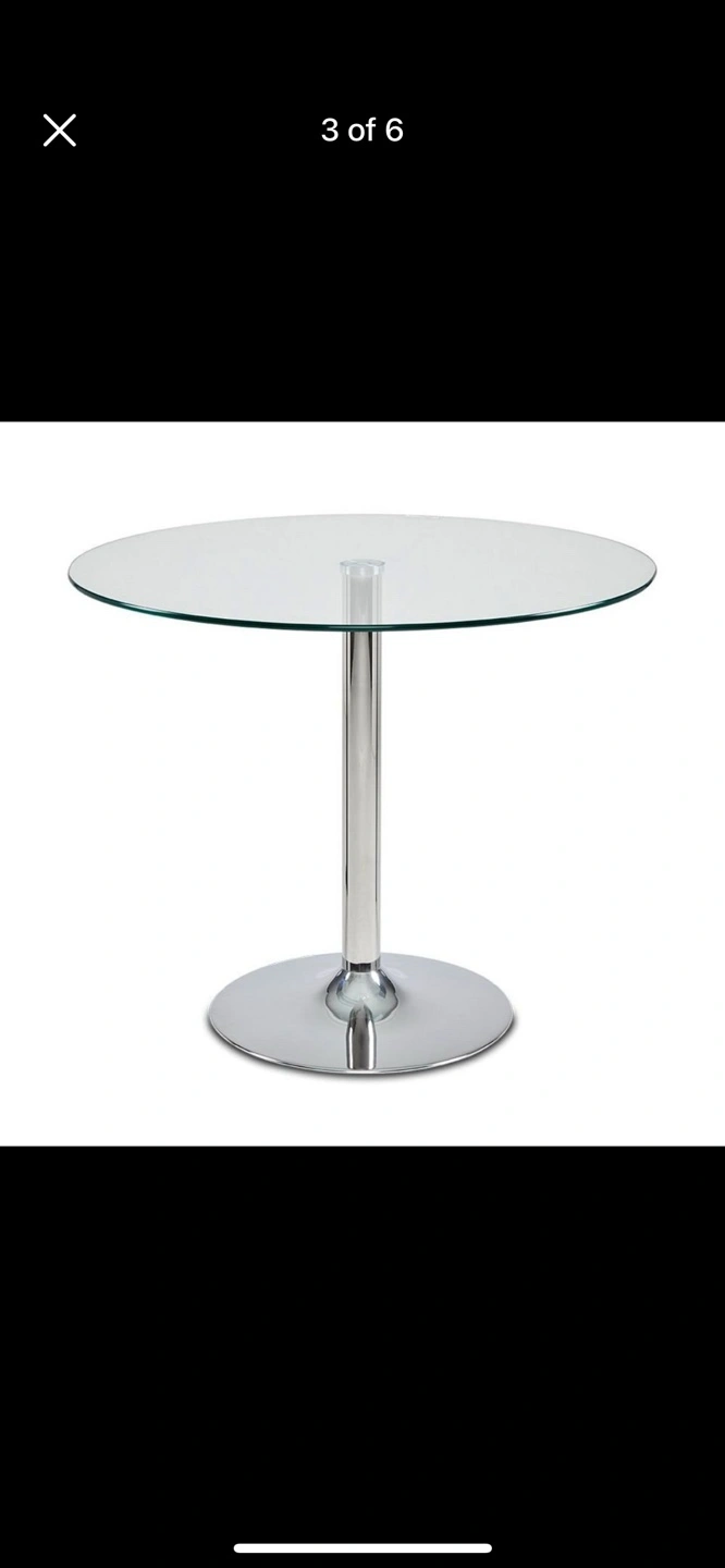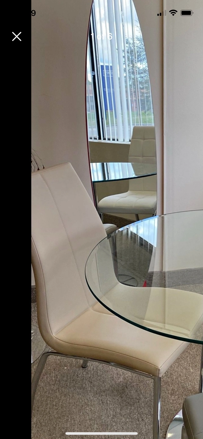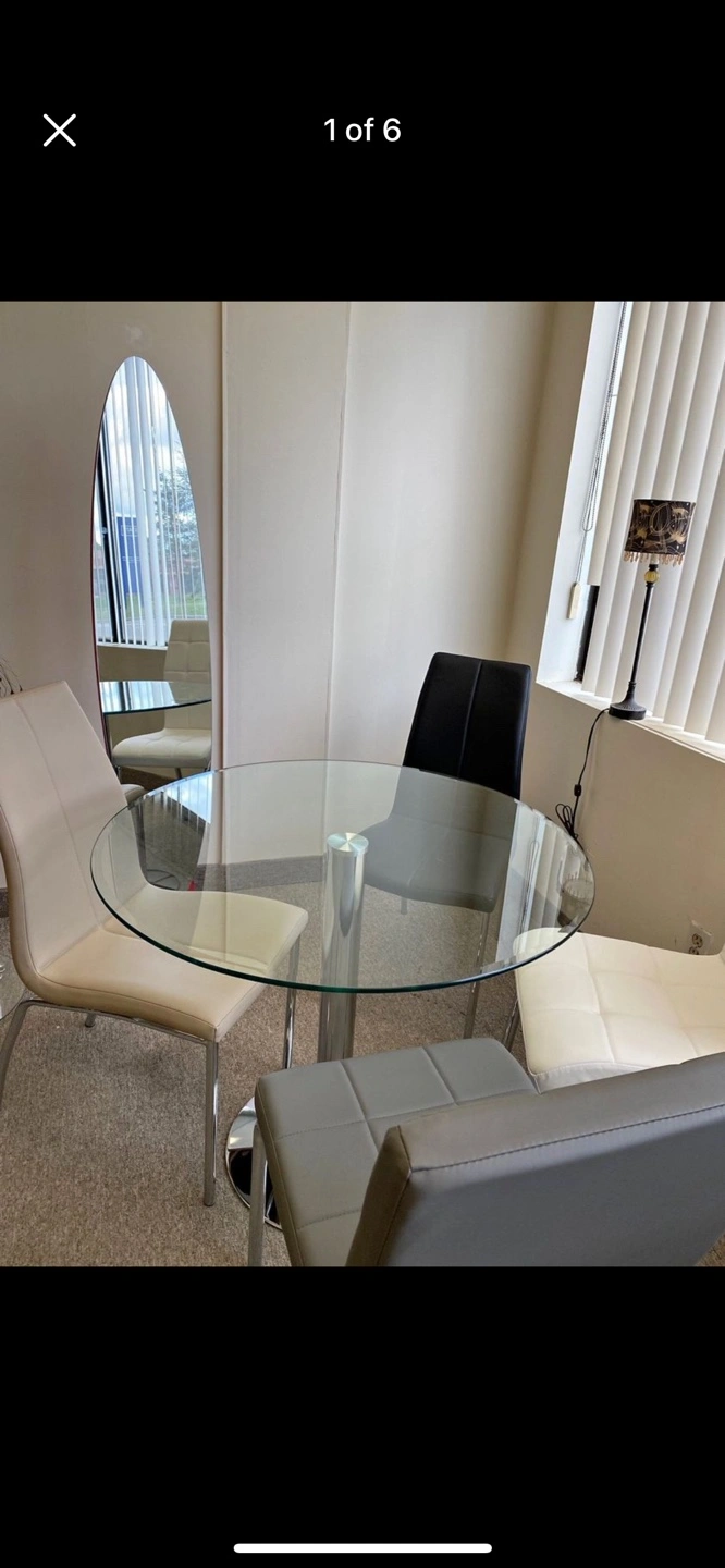 36” Round bevelled glass tabletop and chrome base, four elegant chairs with white leatherette upholstery and chrome legs.