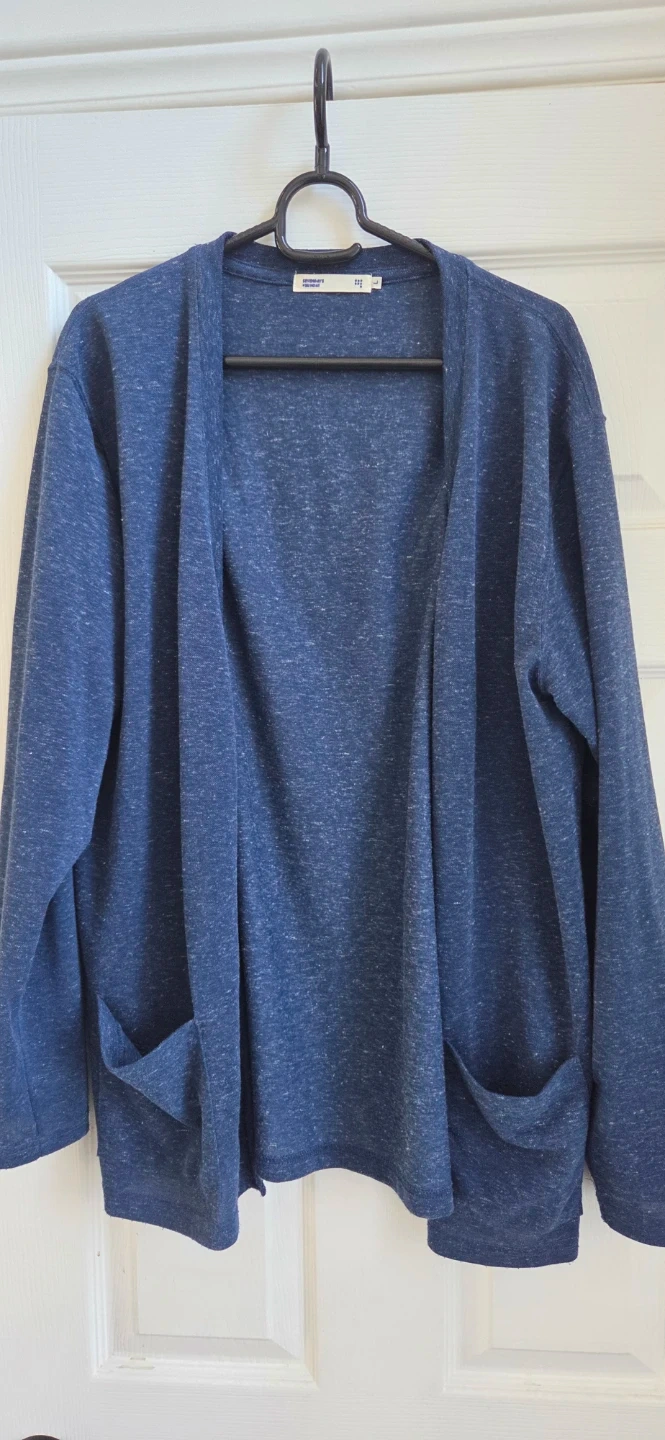 A blue George cardigan in size L with two front pockets. It's made from a soft, marled knit fabric. This layering piece is great for adding a bit of warmth.