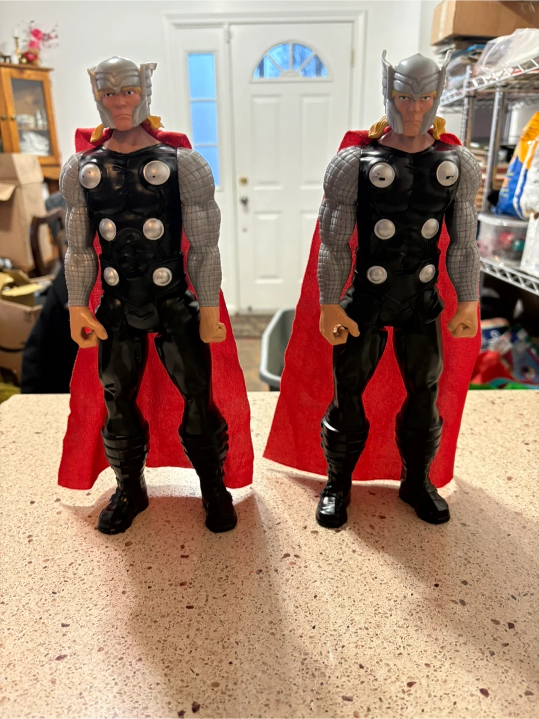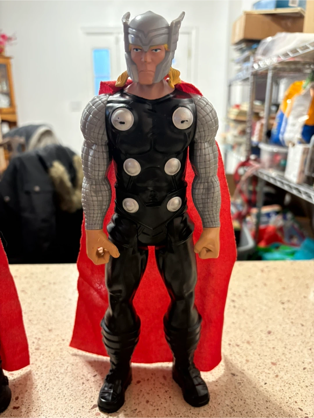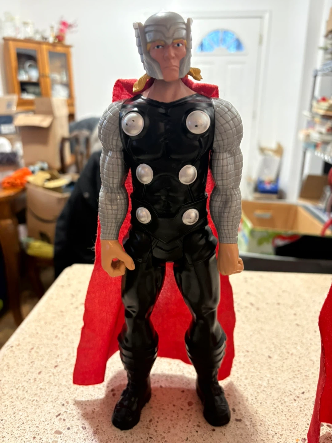 This is a Thor action figure with his signature red cape. It's ready for playtime or display. It's made of plastic.