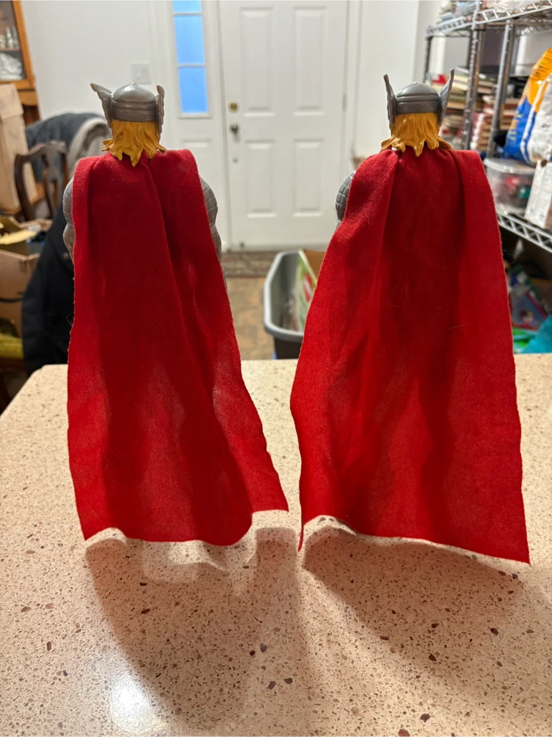 This is a Thor action figure with his signature red cape. It's ready for playtime or display. It's made of plastic.