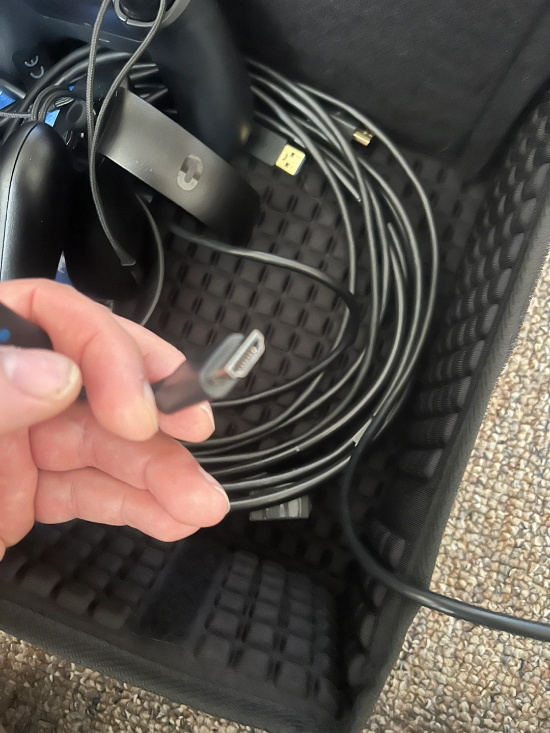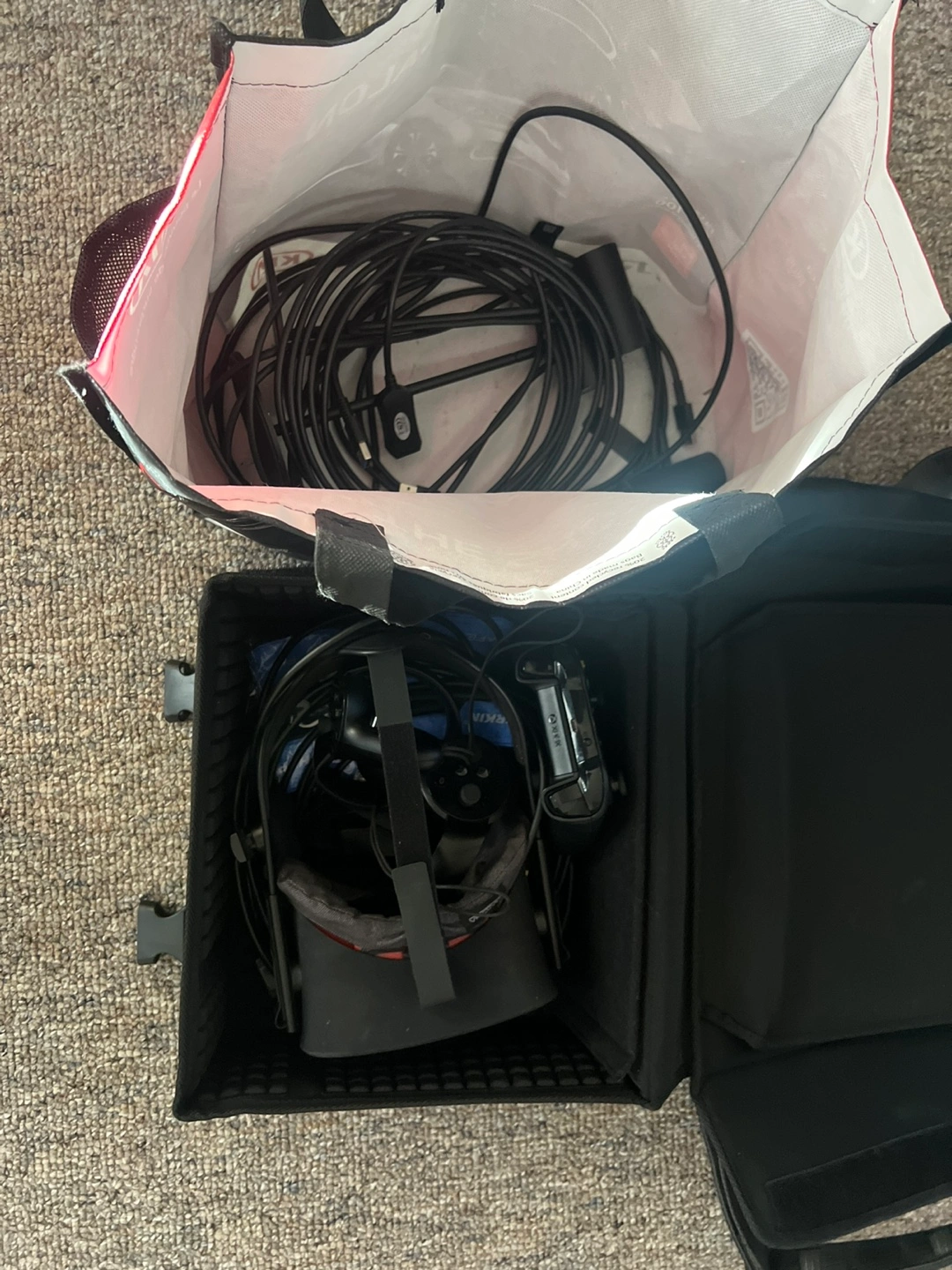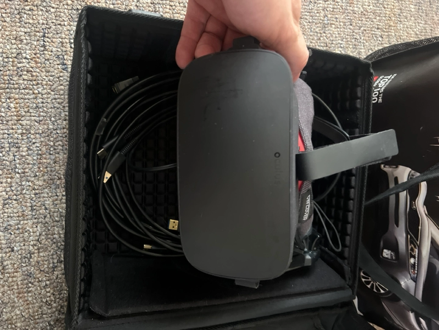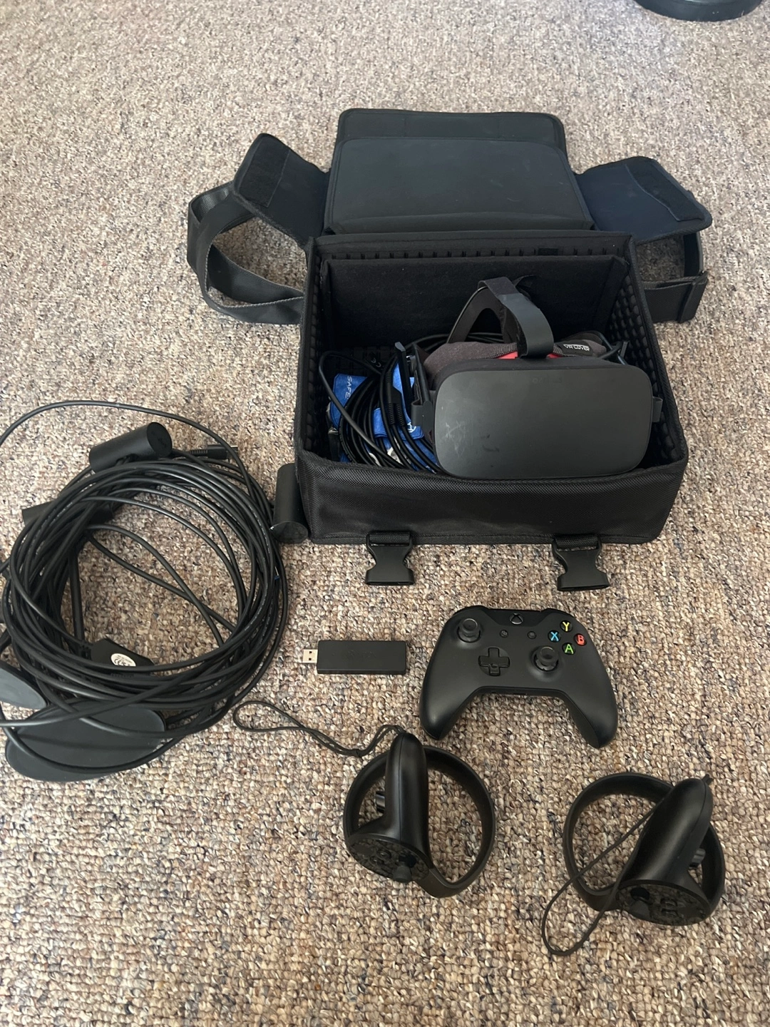 Oculus Rift VR headset, controllers, and all necessary cables. Includes carrying case and Xbox One controller. Pre-owned, some wear.
