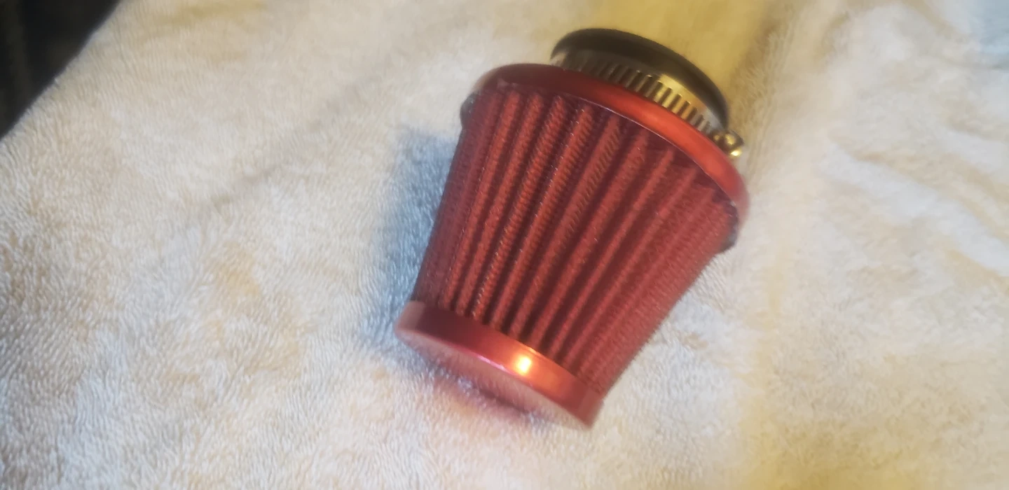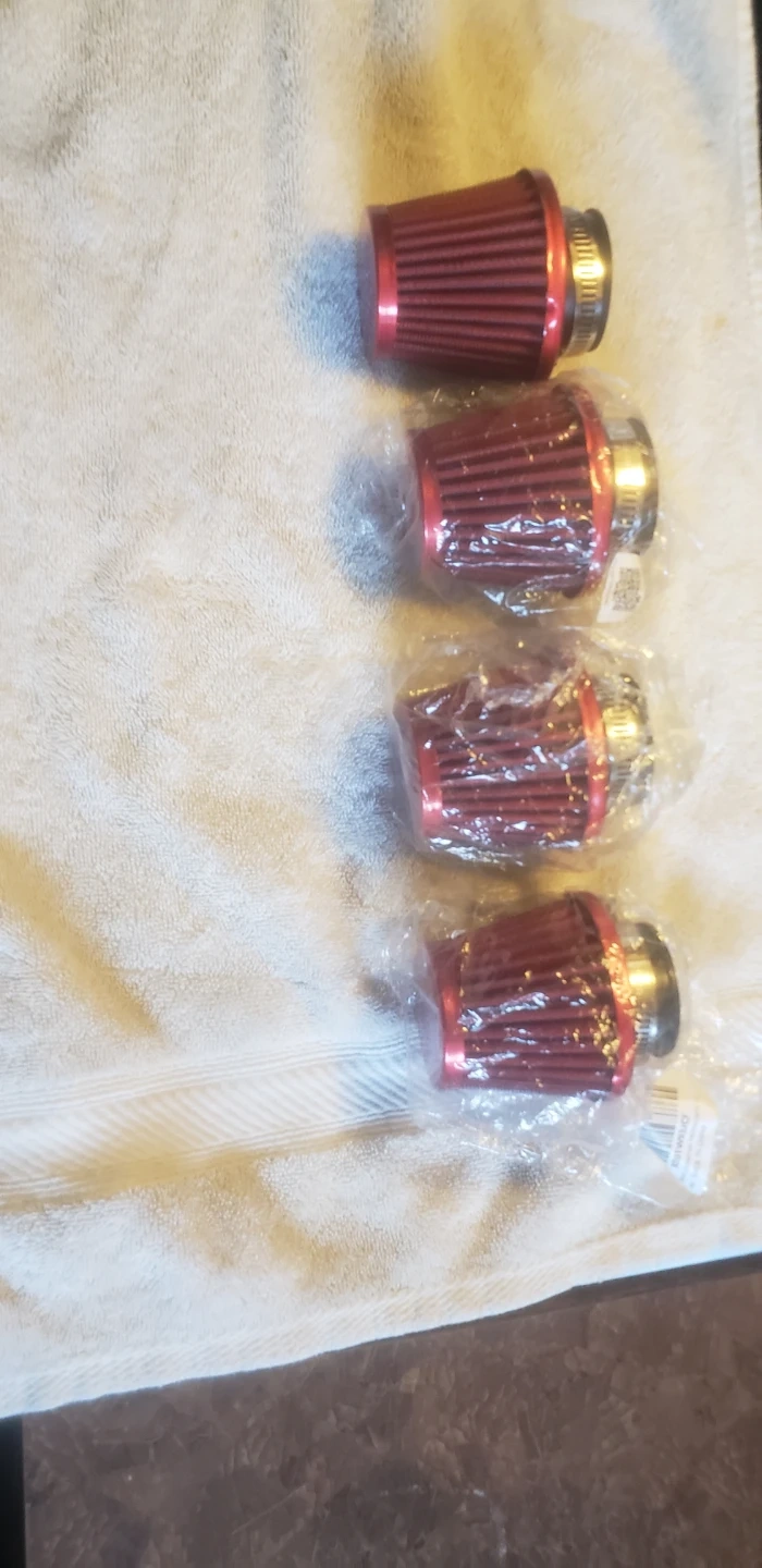 Four red universal motorcycle air filters, each with a 38mm opening and a metal clamp. These are designed for motorcycles. Made located in Marlborough NE 25$ for all 4..