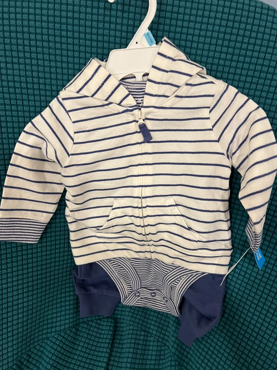 This adorable Carter's hoodie and bodysuit set is brand new with tags! The hoodie features a classic striped design and a convenient zip-up front, perfect for layering. The bodysuit complements the hoodie with a matching striped pattern and snap closures for easy changes
