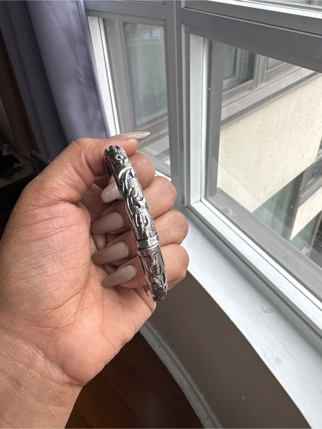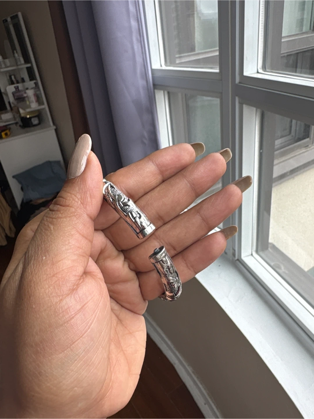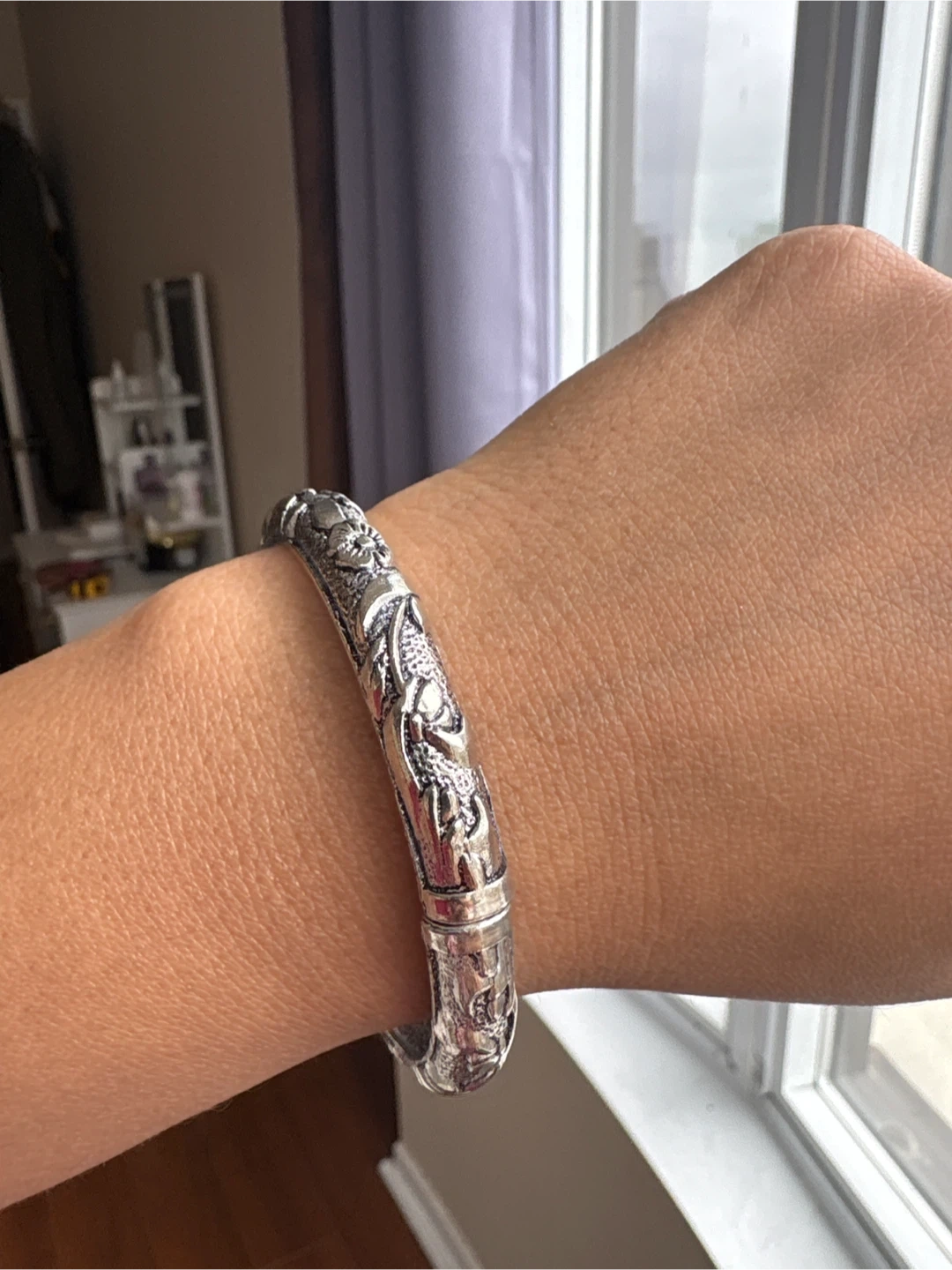 This is a decorative bangle bracelet with intricate detailing. It's made of a silver-toned metal and opens with a clasp. It's a unique accessory that adds a touch of elegance.