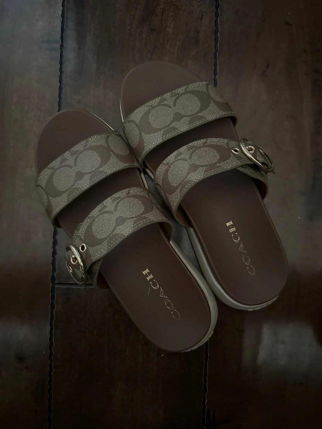 Sandals with two straps. Buckle detailing on the straps. Signature pattern on the straps. A great choice for summer relaxation.