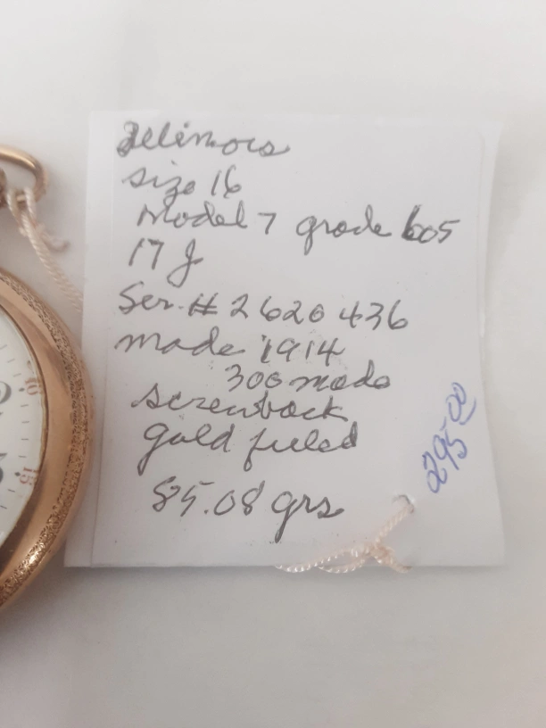 Gold-filled pocket watch. Size 16, Model 7, Grade 605. Made in 1914. Serial number 2606476. Screwdriver back. 85.08 grams , $295.00 for viewing call 403 2411387