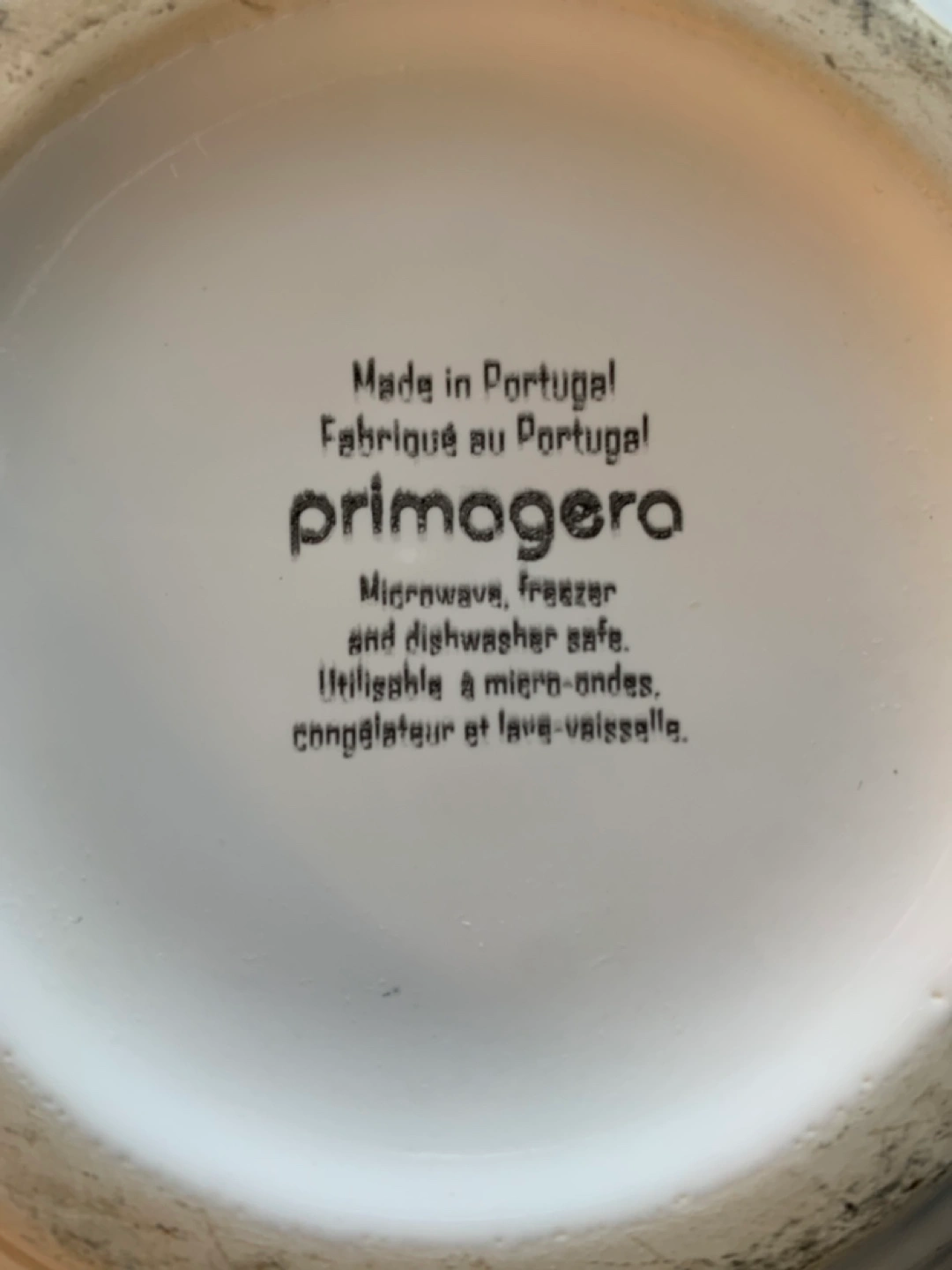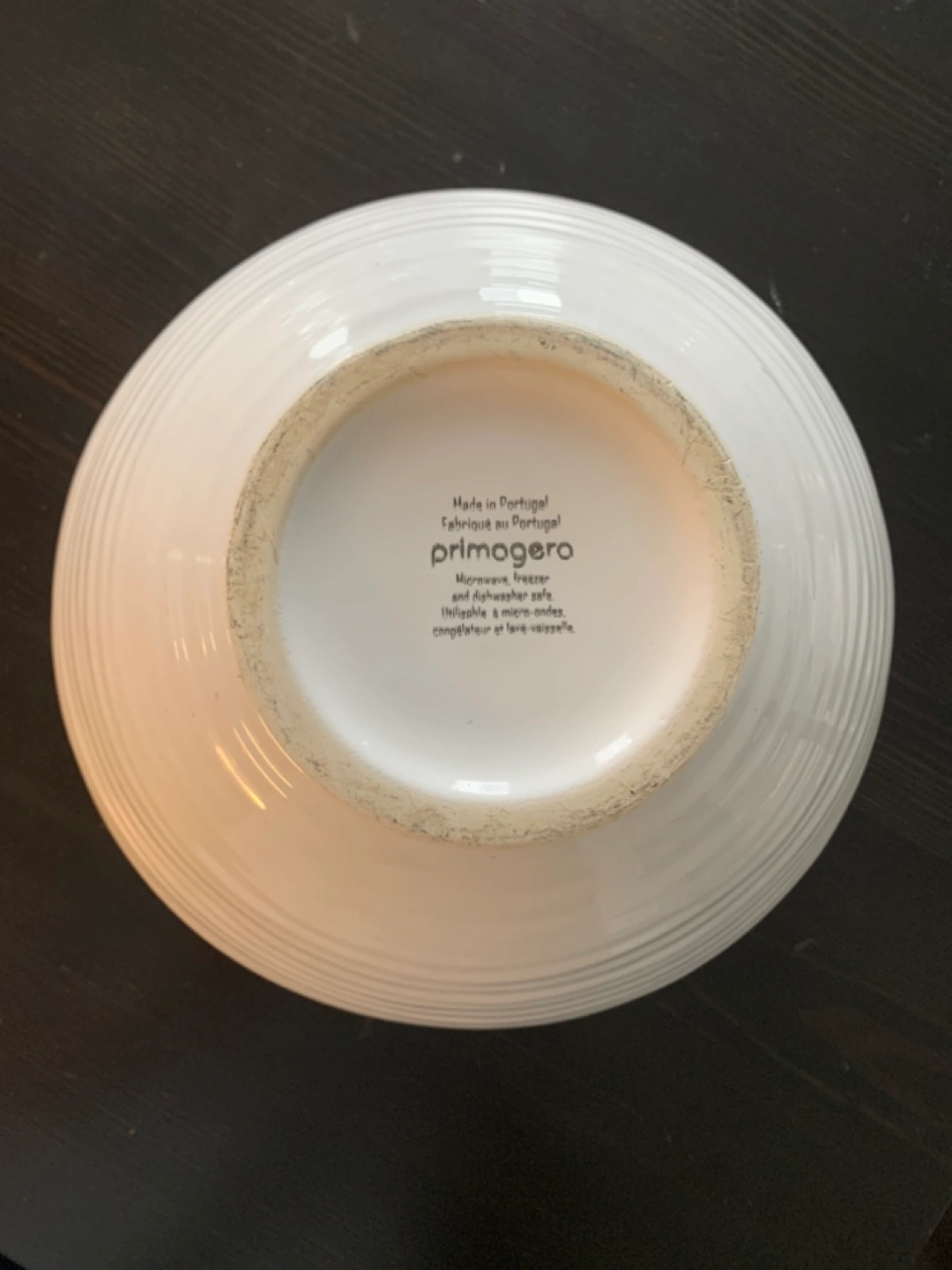 Primogero brand bowl. Microwave, freezer, and dishwasher safe. White ceramic. Approximately 15cm tall.