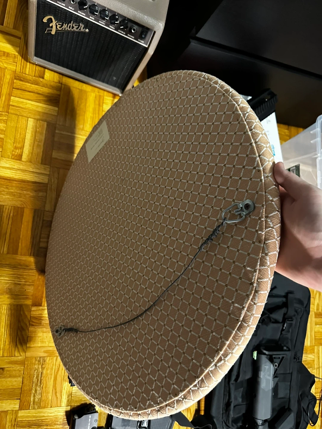 This is a round decorative wall mirror with a tan textured frame. It has a textured diamond pattern and a wire for hanging. It's a nice accent piece for any room!