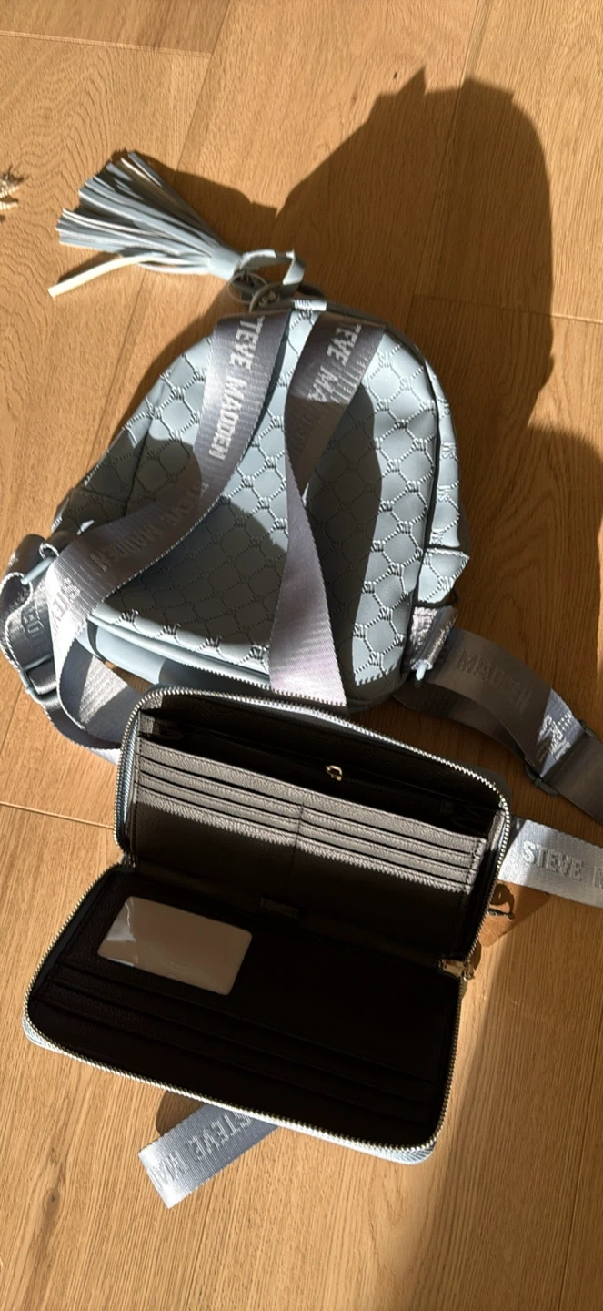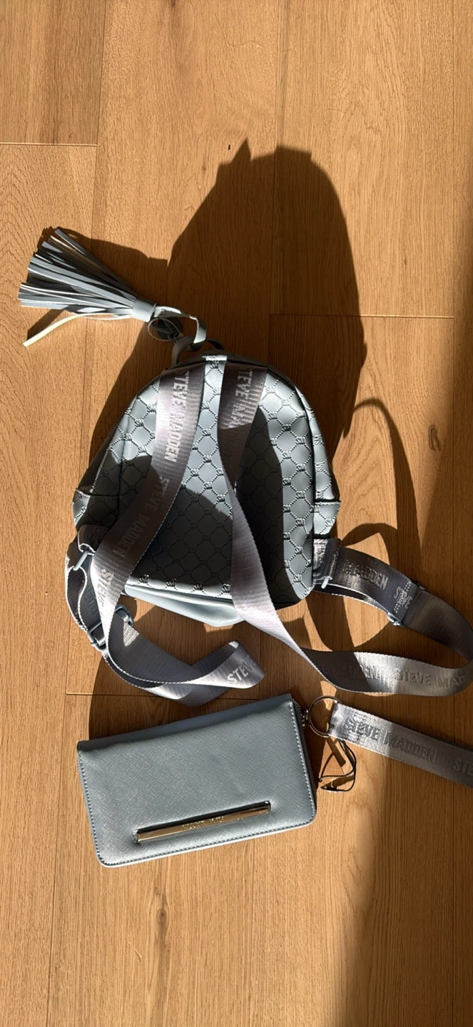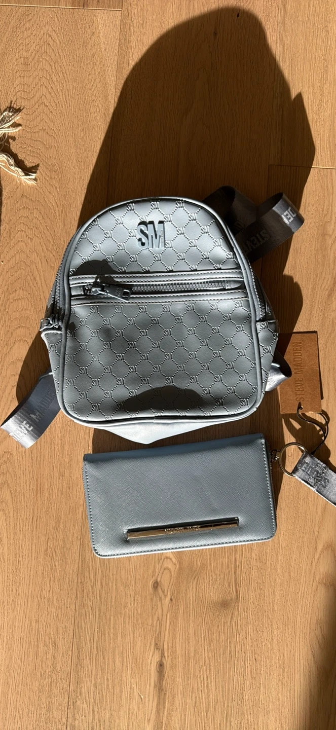 Light blue faux leather mini backpack and matching zip-around wallet set. The backpack features quilted stitching and adjustable straps with 'Steve Madden' branding. The wallet has multiple card slots and a zippered coin pocket.