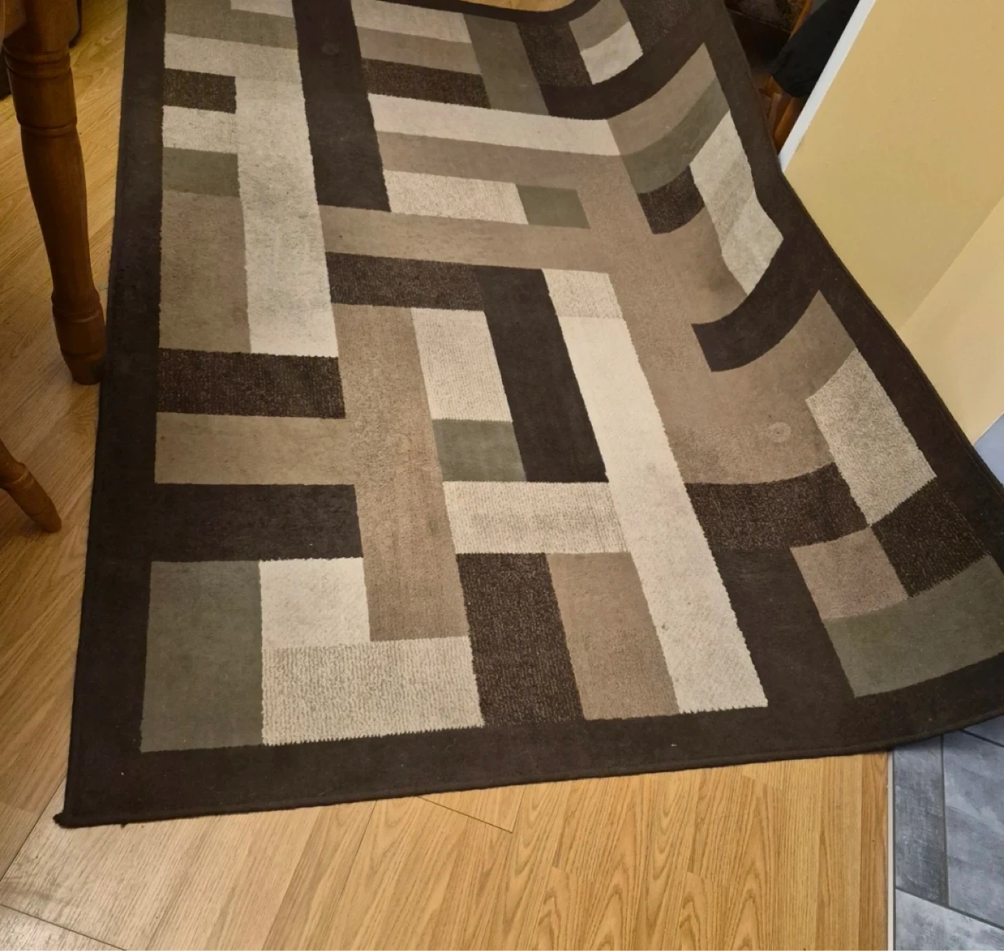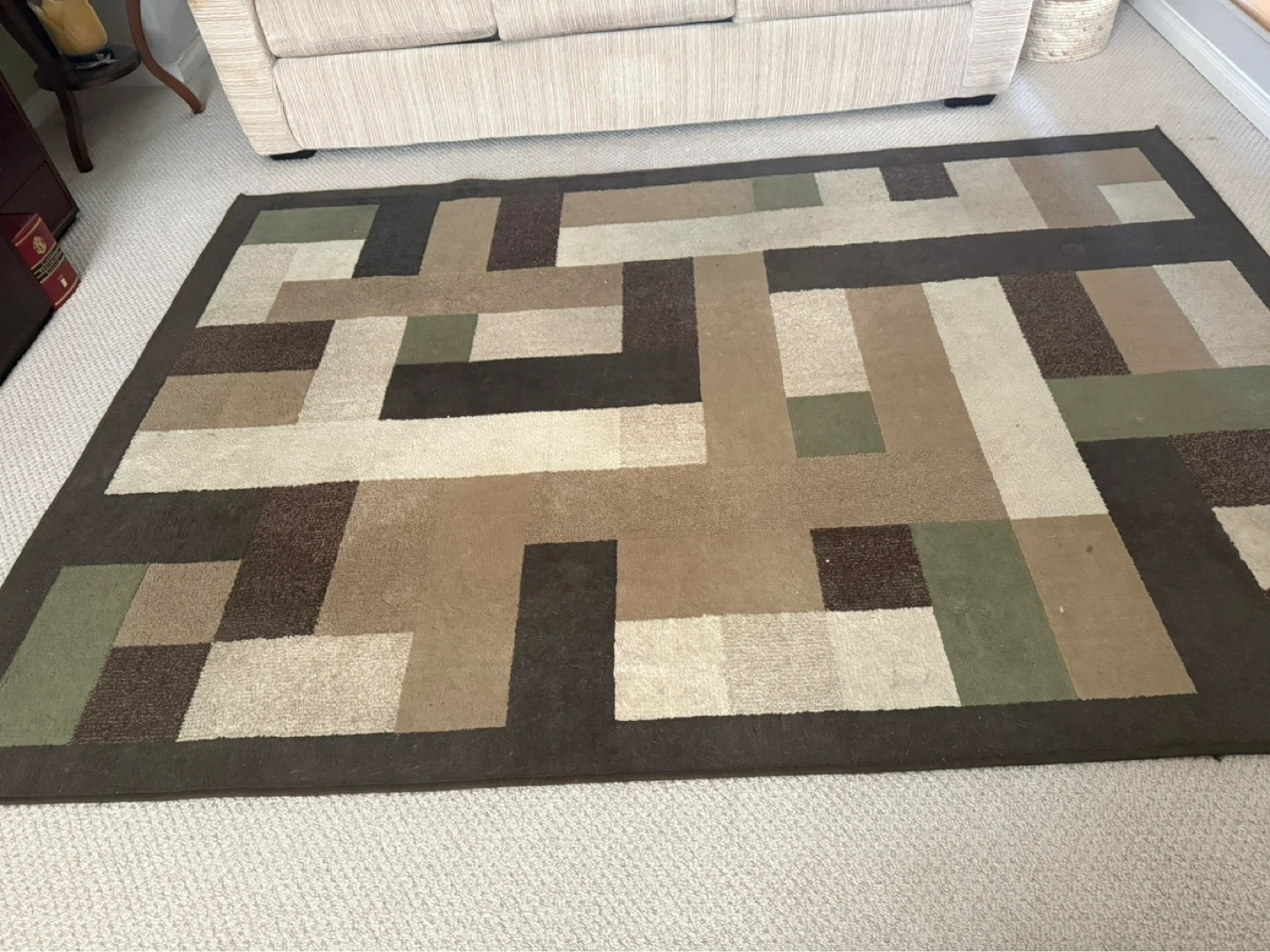 90” X 64” Geometric pattern area rug in earth tone shades. Adds a modern touch to any room. Great condition has been used in low traffic area.