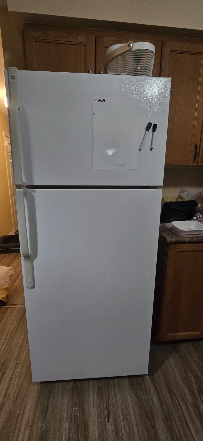 This is a white GE refrigerator with a top freezer. It's a standard-sized appliance, great for keeping groceries fresh. The fridge has multiple shelves and drawers for organized storage.