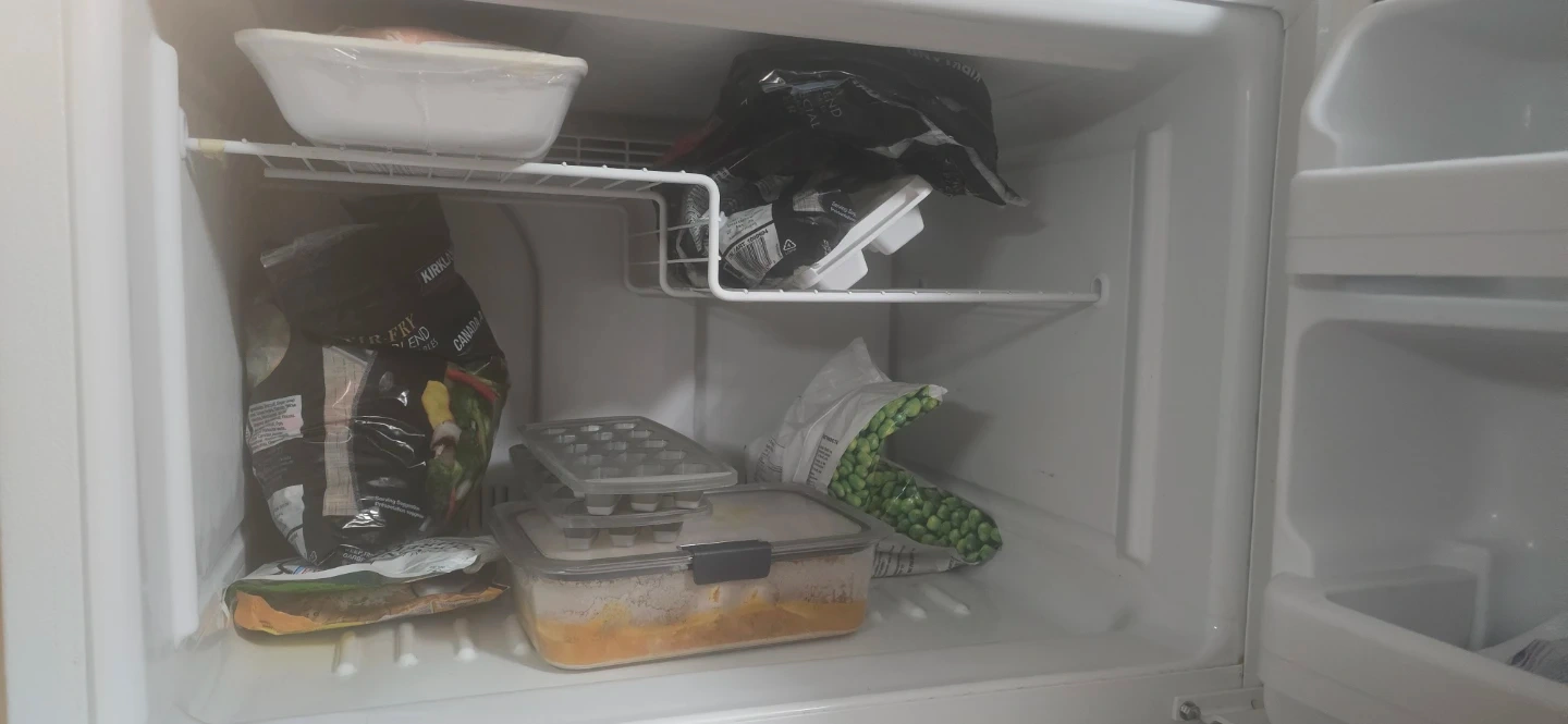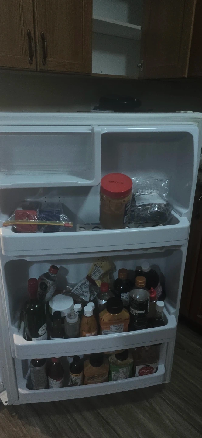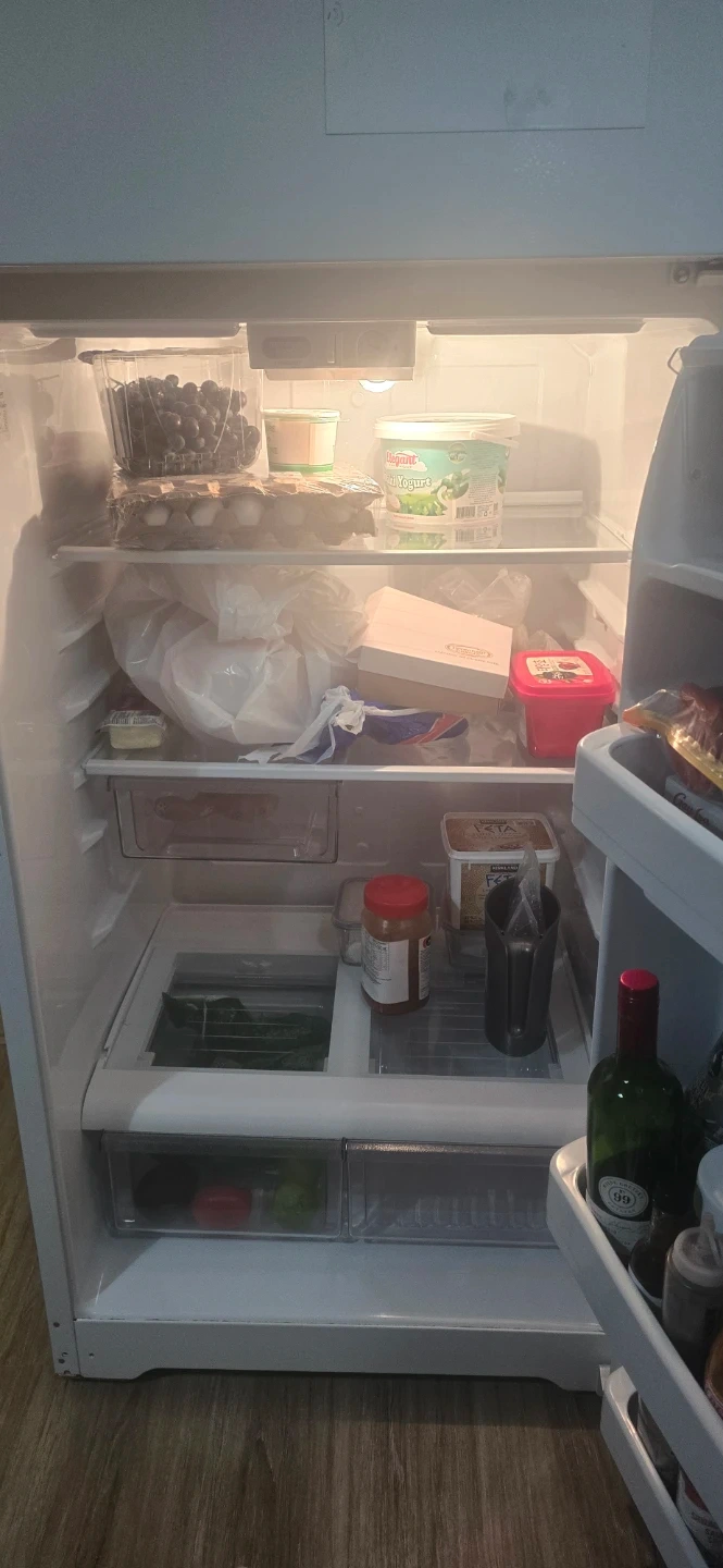 This is a white GE refrigerator with a top freezer. It's a standard-sized appliance, great for keeping groceries fresh. The fridge has multiple shelves and drawers for organized storage.