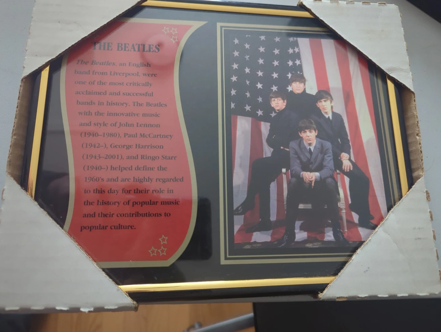Beatles Biography Plaque!! This framed display celebrates the iconic band, The Beatles, from Liverpool. It includes a section detailing their history and contributions to popular music. The display features an image of the band against an American flag background.
