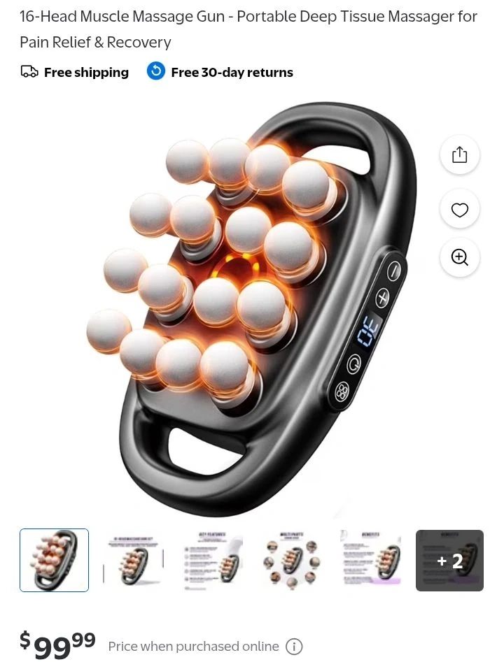 This is a 16-head muscle massage gun designed for deep tissue relief and recovery. It's portable and offers pain relief. The device features multiple massage heads for versatile use. BINGO!!