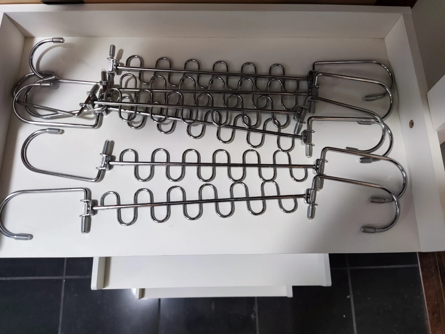 Four silver-tone metal hangers designed for organizing pants or scarves. Each hanger has multiple loops to hold several items.