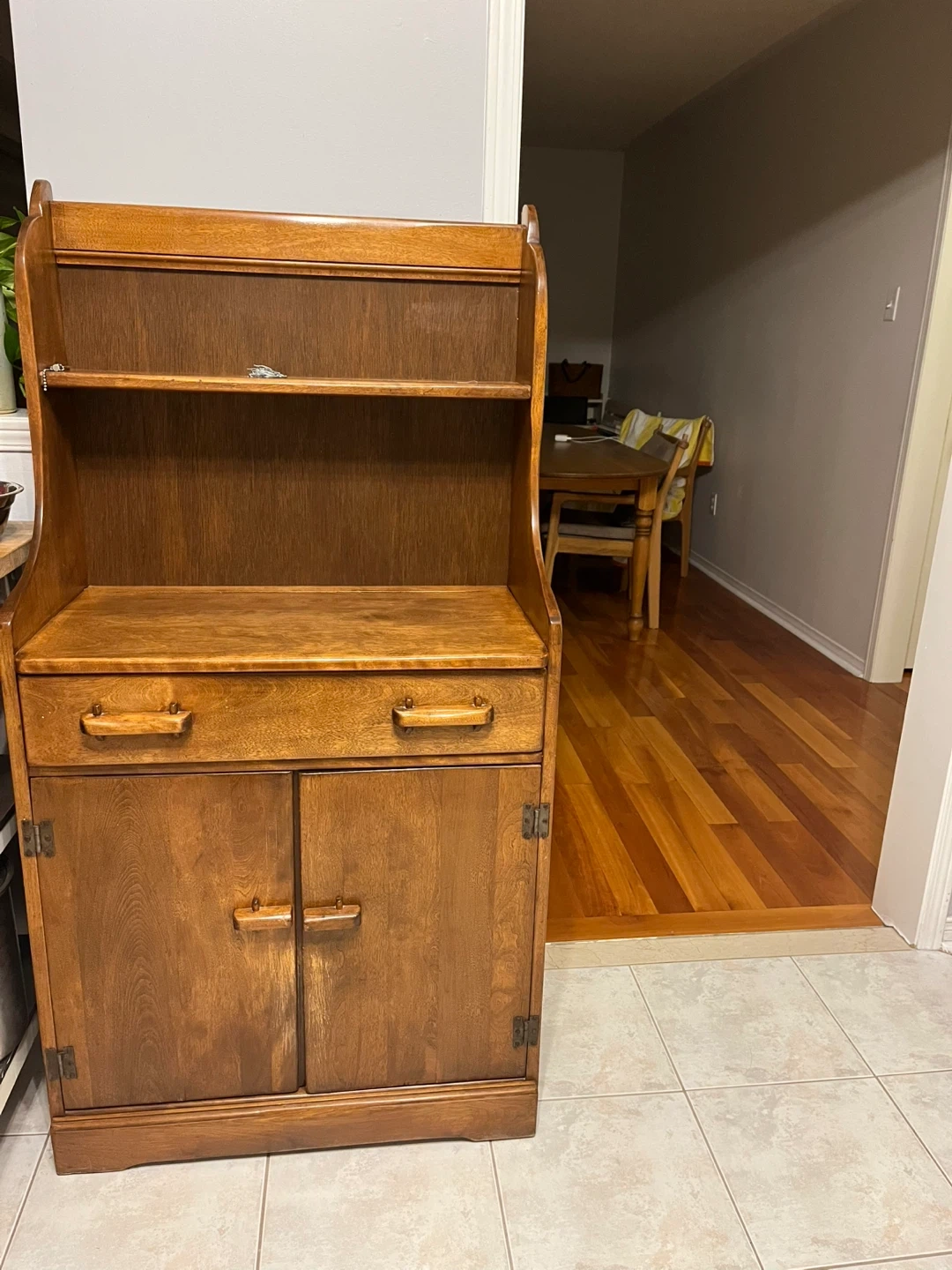 Here's a lovely vintage wooden hutch! It has a classic design with a shelf on top, a drawer, and a cabinet with doors below. Perfect for adding some character to your home