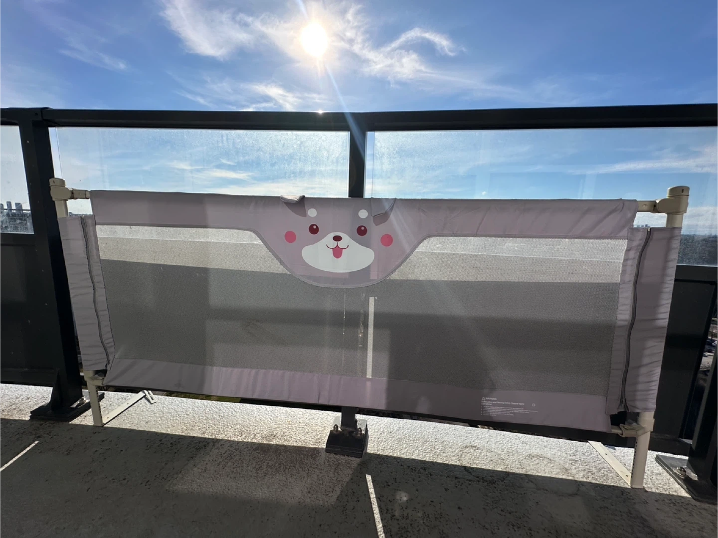 Grey fabric bed rail for toddlers, featuring a cute animal face design. It's 58 inches long and 27.56 inches tall. Easy to install for safety.