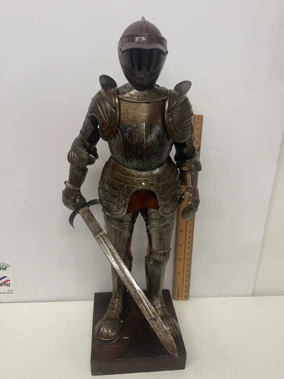 This is a 19th century decorative figurine of a knight in full armor. It features intricate detailing on the metal plating and includes a sword. The figurine stands on a wooden base.