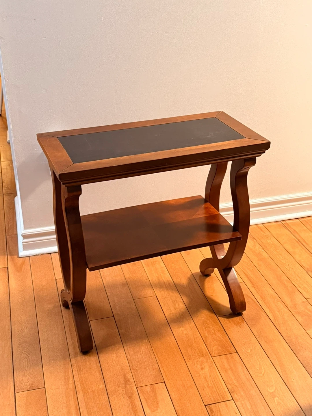 Solid hardwood construction with a black leather surface and lower storage shelf.