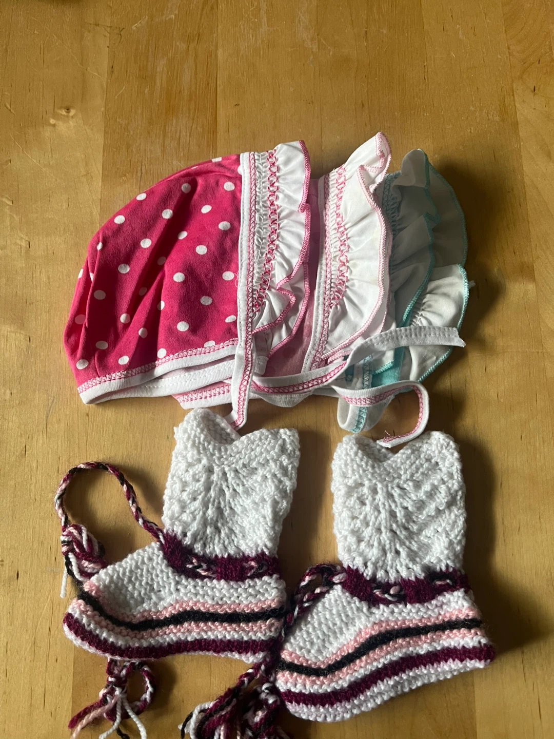 This adorable set includes a pink polka dot hat with white trim, a white diaper cover with ruffles, and a pair of white knitted booties with colourful stripes. It's a sweet outfit for a little one's photos or special occasions. The hat and diaper cover are made of soft fabric, and the booties are hand-knitted.