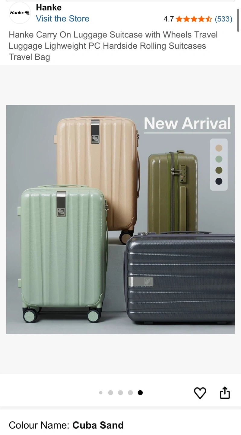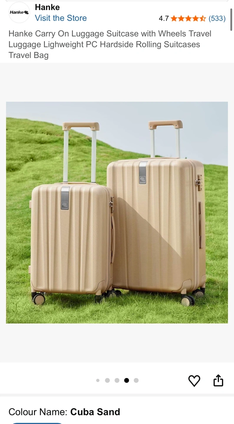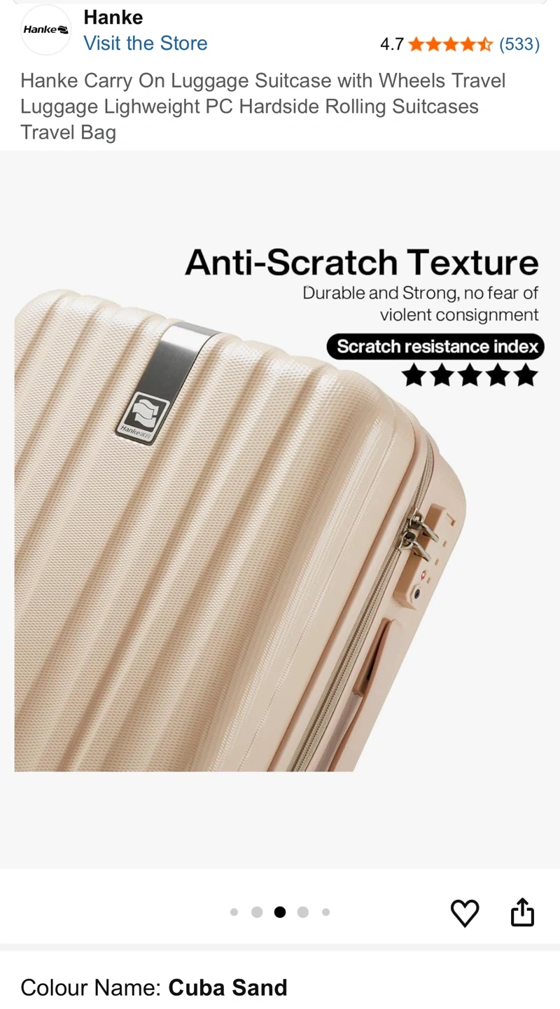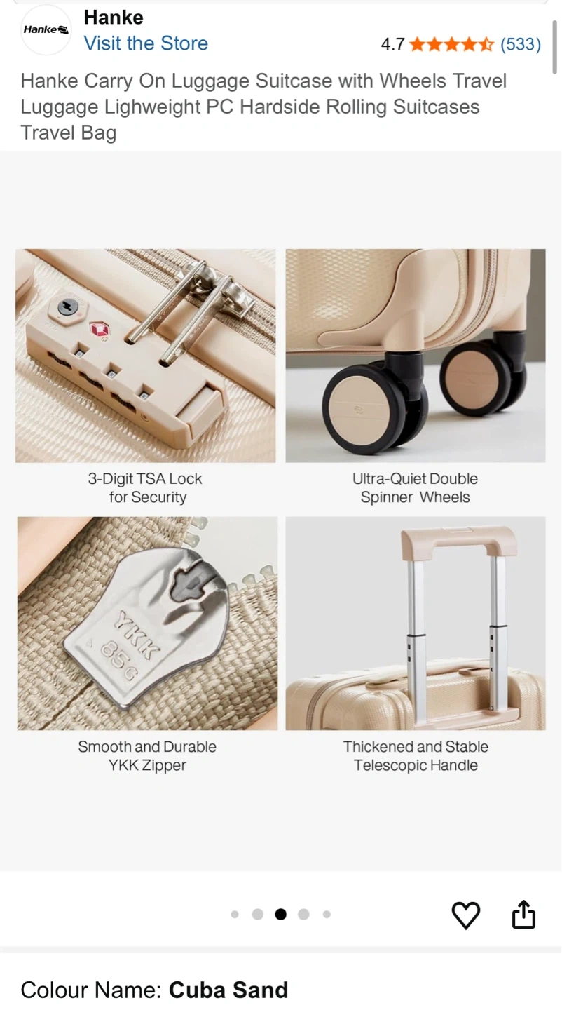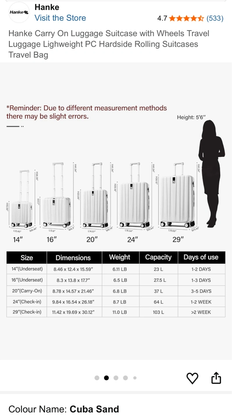 This Hanke carry-on suitcase is a lightweight PC hardside rolling travel bag. It features spinner wheels and an anti-scratch texture. The interior has a reasonable divider with multiple pockets for organization. Perfect for weekend trips or short business travel!