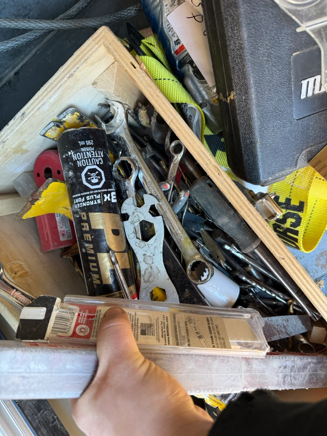 This is a collection of various tools and supplies. It includes a tube of construction adhesive and some assorted wrenches and drill bits. Many different items are included in this lot.