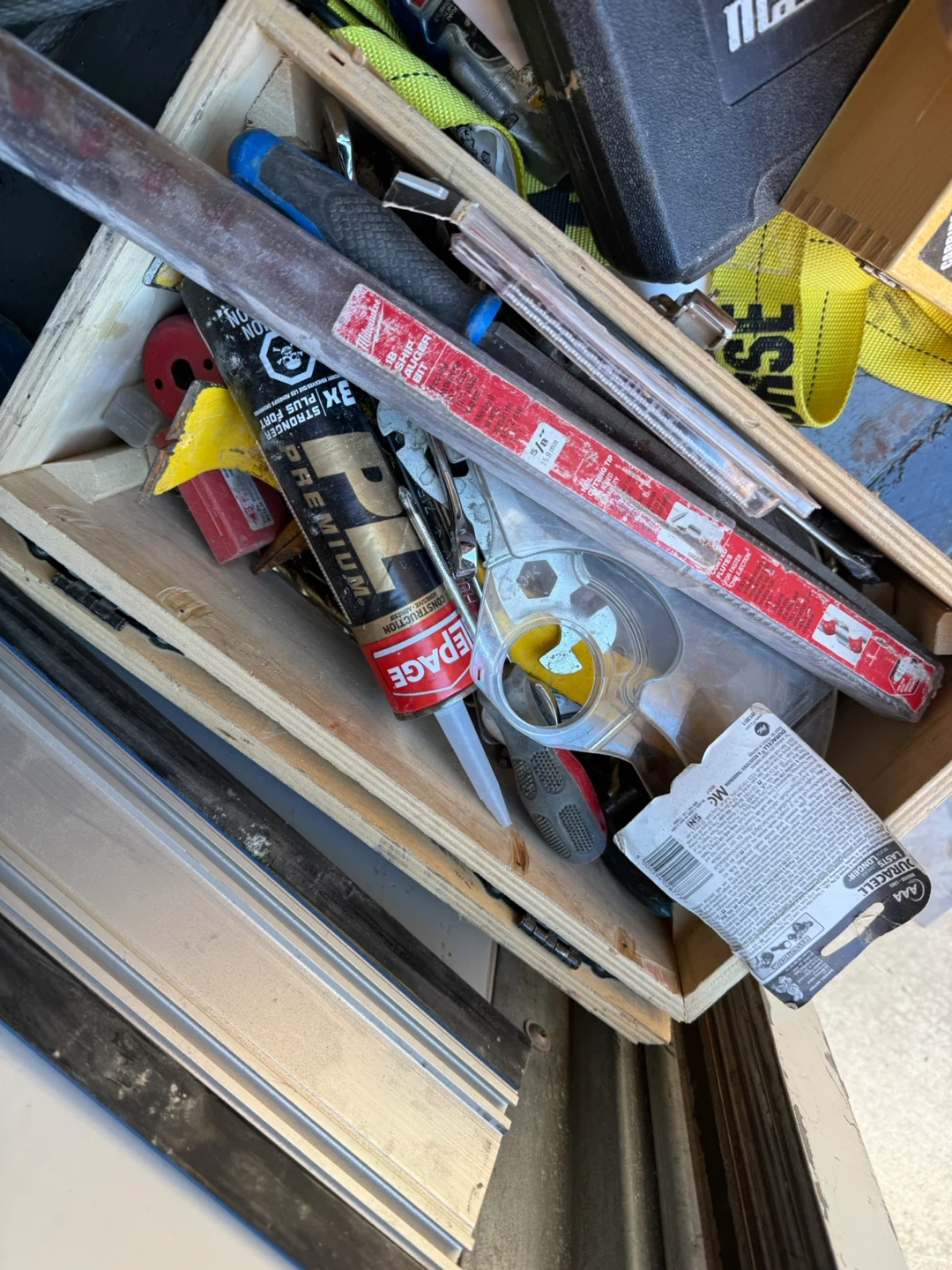 This is a collection of various tools and supplies. It includes a tube of construction adhesive and some assorted wrenches and drill bits. Many different items are included in this lot.