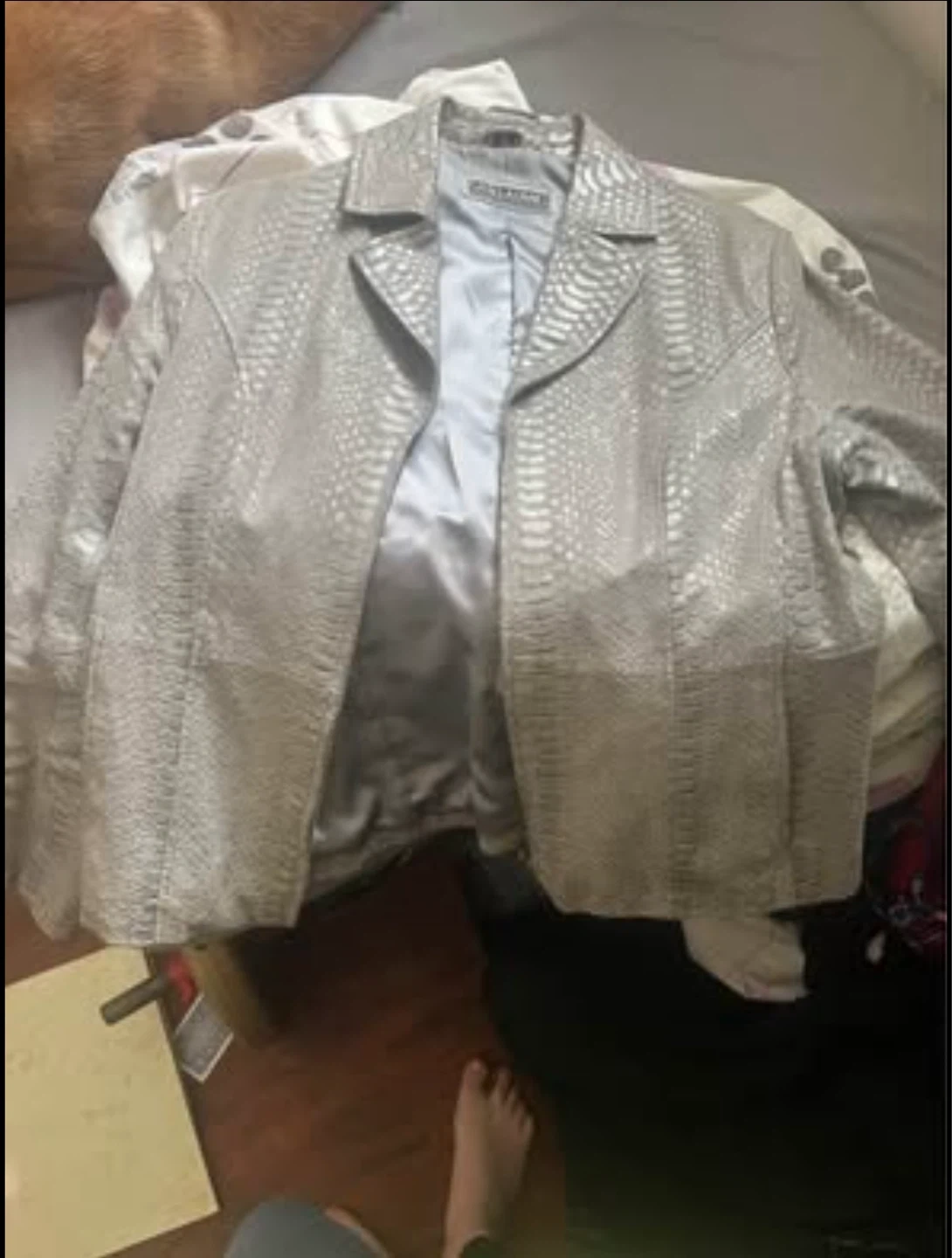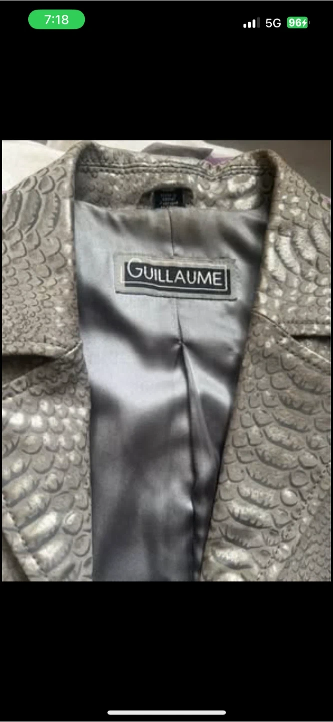 This is a GUILLAUME blazer jacket with a distinctive silver textured finish. It features a smooth, satin-like lining for comfort. This jacket offers a stylish layer for various outfits.