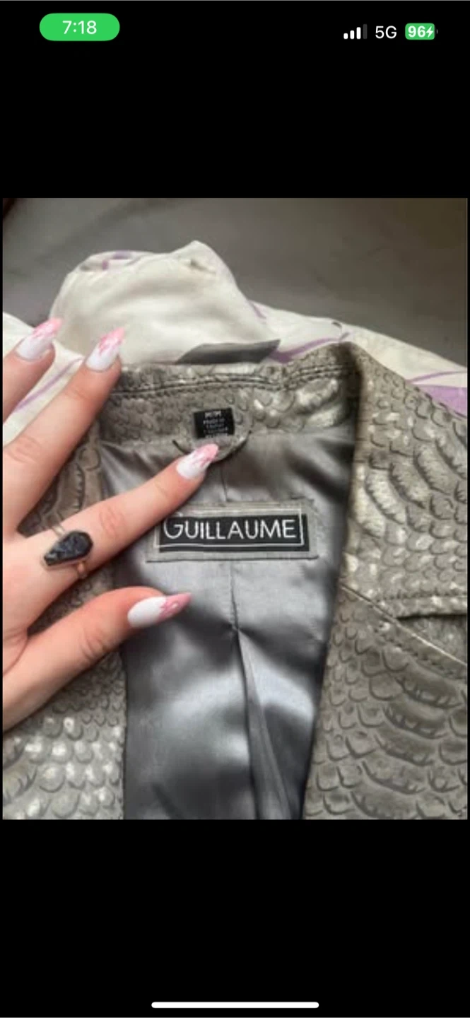 This is a GUILLAUME blazer jacket with a distinctive silver textured finish. It features a smooth, satin-like lining for comfort. This jacket offers a stylish layer for various outfits.