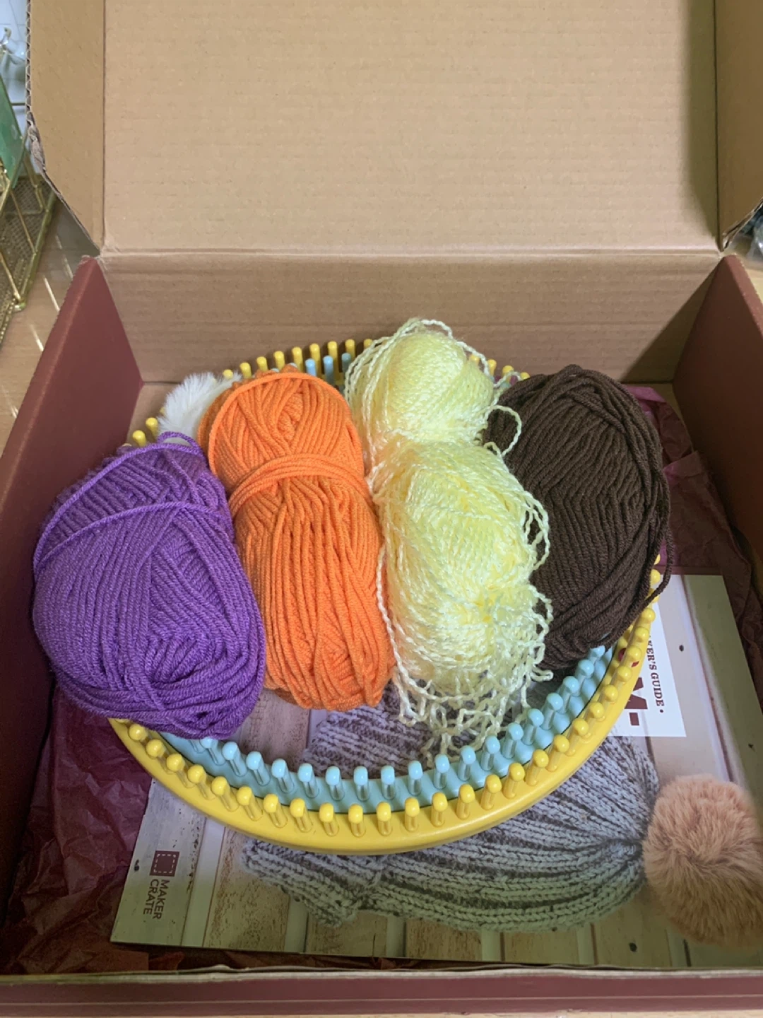 Selling a Maker Crate knitting loom set! It comes with a variety of colourful yarns, a knitting loom, and a user's guide. Perfect for anyone who wants to try knitting or create fun projects