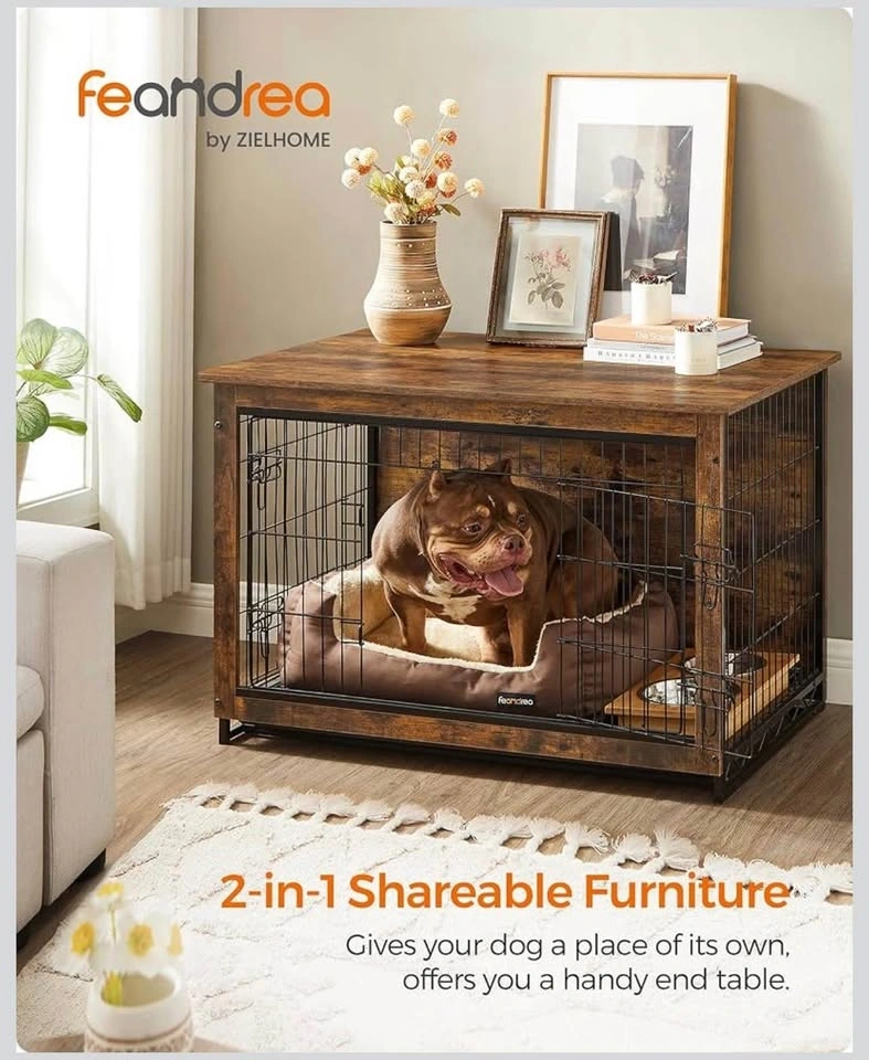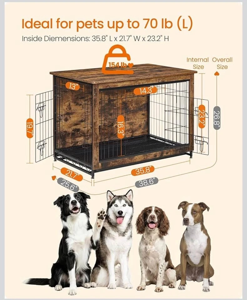 Elevate your pet's comfort with this new, heavy-duty dog crate, perfect for dogs up to 32 kg (70 lbs). This crate is designed with both your pet's safety and your home's style in mind. Key features include: Sturdy metal frame with a rustic brown wood finish. Two doors for easy access. Removable tray for easy cleaning. Doubles as an end table, blending seamlessly with your home decor. Ideal for dogs needing a secure and cozy space. Give your furry friend the perfect den with this versatile and stylish dog crate!
