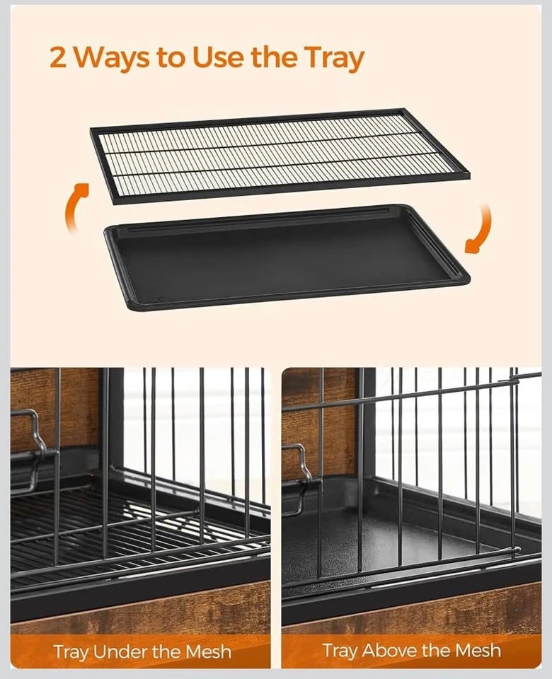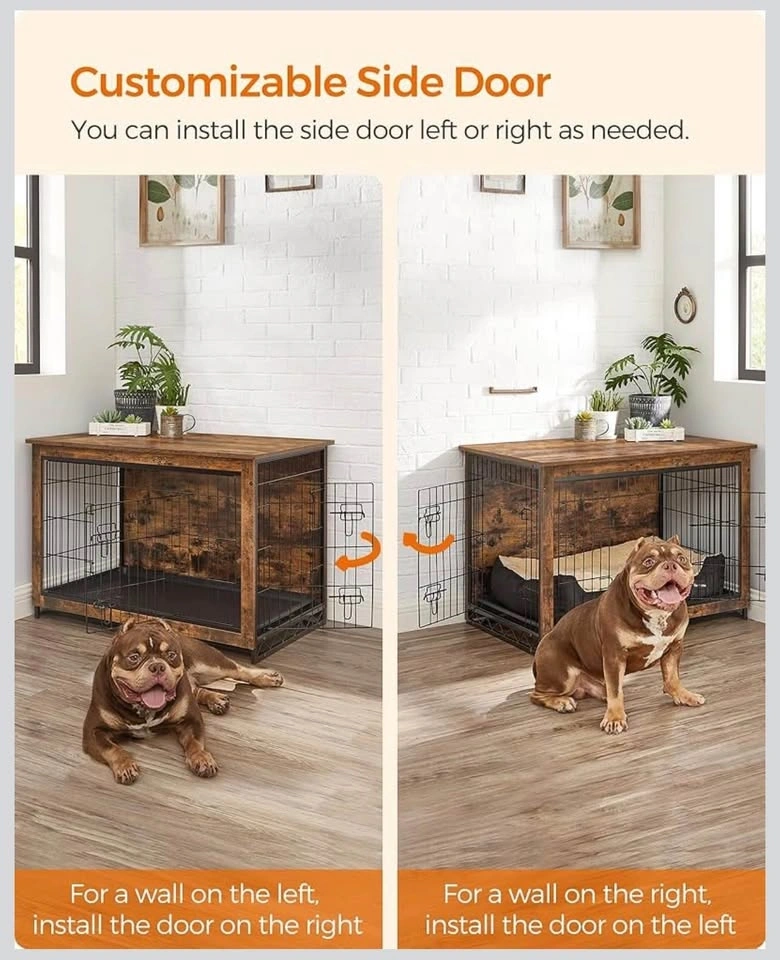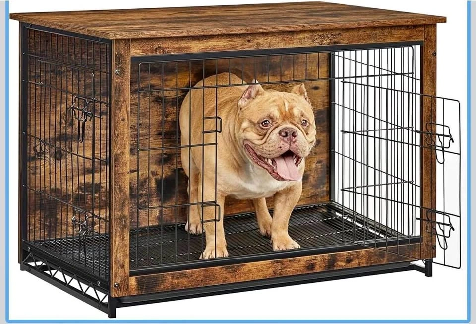 Elevate your pet's comfort with this new, heavy-duty dog crate, perfect for dogs up to 32 kg (70 lbs). This crate is designed with both your pet's safety and your home's style in mind. Key features include: Sturdy metal frame with a rustic brown wood finish. Two doors for easy access. Removable tray for easy cleaning. Doubles as an end table, blending seamlessly with your home decor. Ideal for dogs needing a secure and cozy space. Give your furry friend the perfect den with this versatile and stylish dog crate!