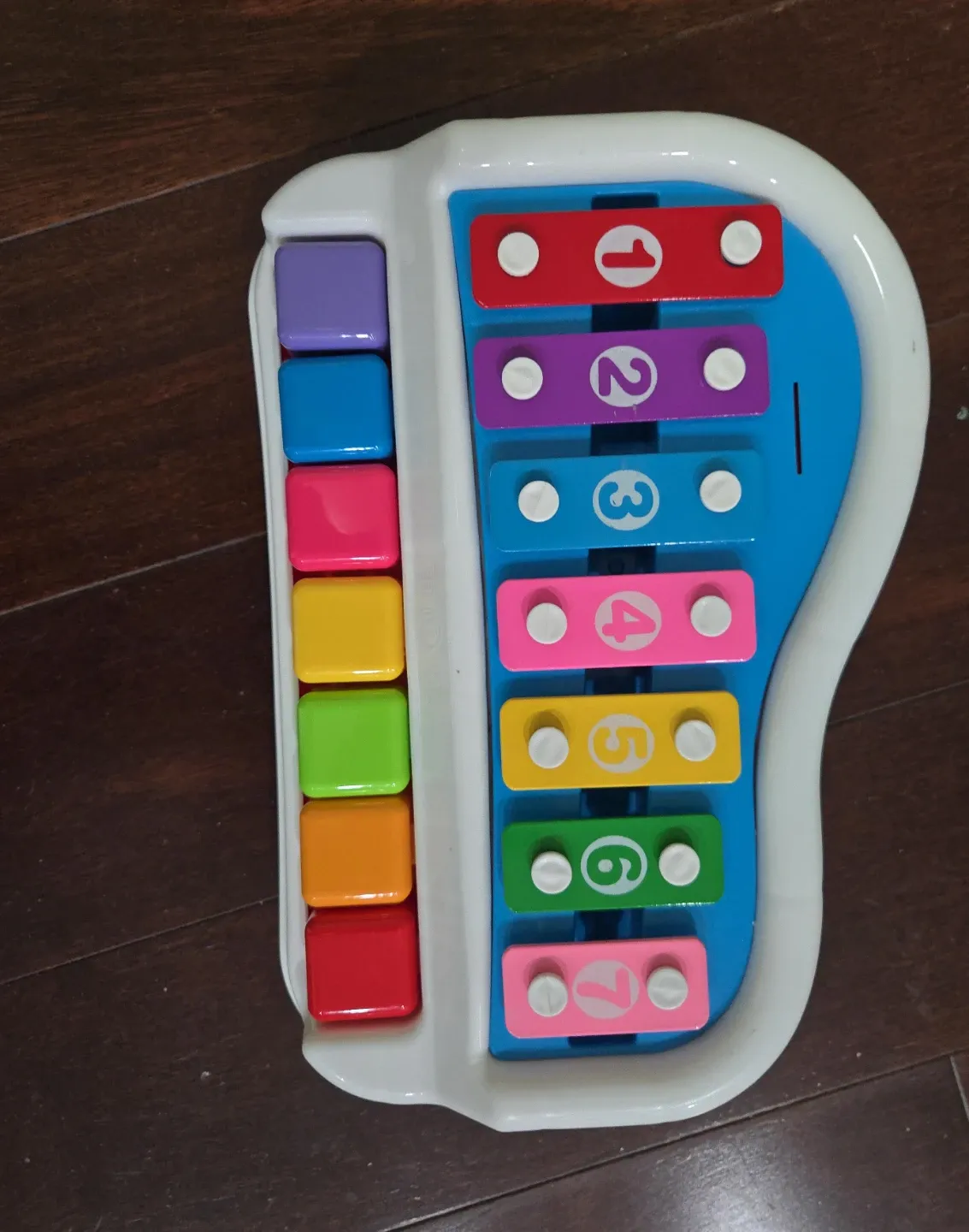 This colourful Fisher-Price toy piano is a xylophone with 8 metal bars. It has numbers 1-7 printed on the bars and comes with a mallet for playing. It's great for introducing little ones to music and colours!